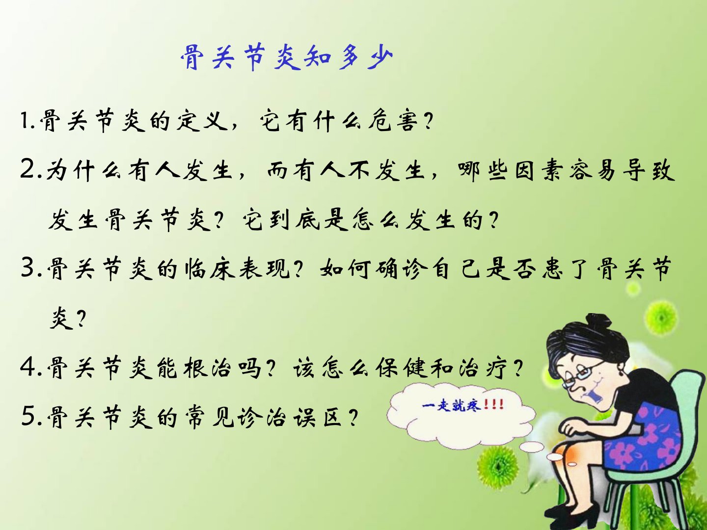 作为一名医生现对骨关节炎相关内容进行摘要:骨关节炎是关节软骨退行性病变和继发骨质增生的慢性疾病主要表现为关节软骨生化代谢异常和结构损害女性患者多于男性。骨关节炎是老年人致残首要原因53患者会丧失劳动力还会降低患者生活质量影响身心健康。4065岁是骨关节炎高发年龄肥胖、遗传、职业等因素也会增加患病风险。骨关节炎症状包括疼痛、晨僵、关节肿胀、积液、变形等实验室检查中C反应蛋白和红细胞沉降率可能轻度升高X线、MRI可辅助诊断。治疗方面非药物治疗包括患者教育、物理治疗、肌肉锻炼等;药物治疗包括局部用药、止痛药、软骨保护剂等;手术治疗包括截骨术、关节置换术等。骨关节炎治疗存在误区如认为应少动、锻炼能磨掉骨刺、爬山爬楼有益、消炎止痛药能根治等。实际上正确适当锻炼可预防延缓OA进程骨刺不会随锻炼消失老年人应避免过度负重消炎止痛药只能治标。