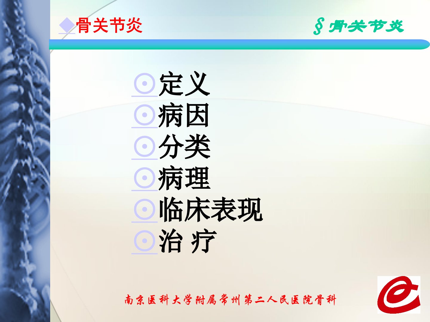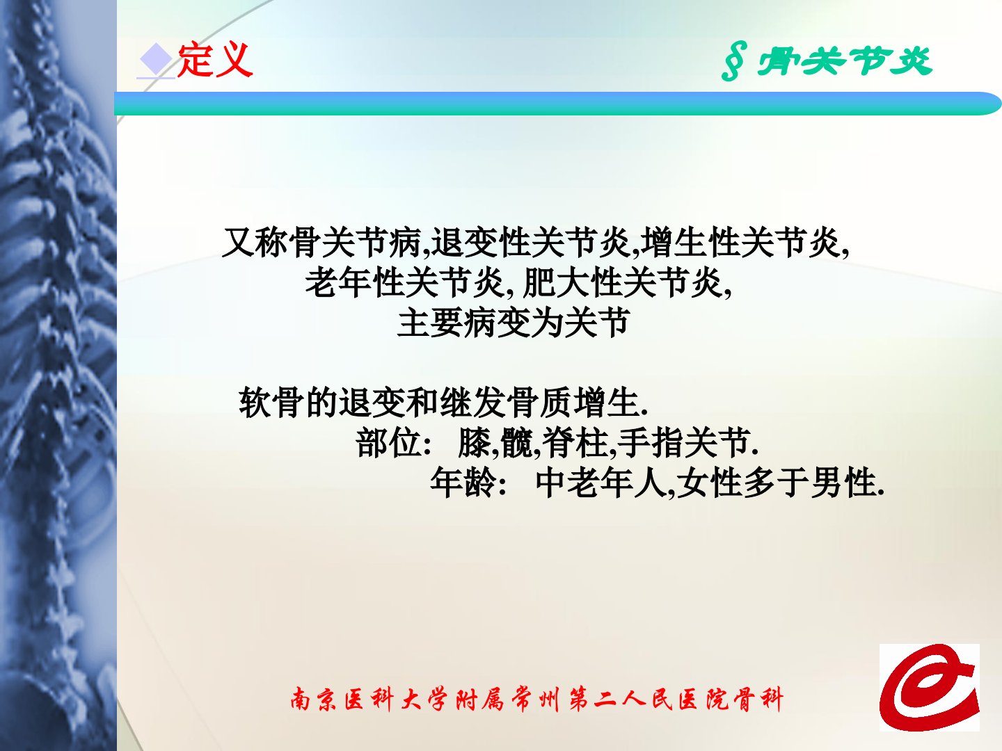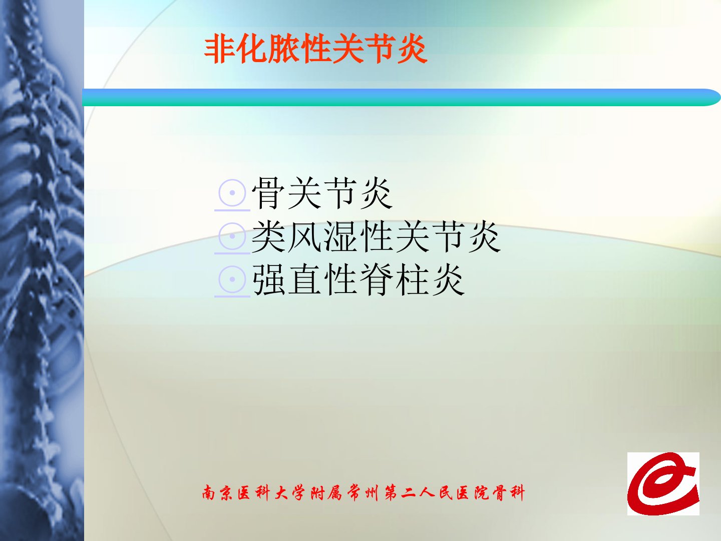 非化脓性关节炎主要包括骨关节炎、类风湿性关节炎和强直性脊柱炎。骨关节炎又称骨关节病主要病变为关节软骨退变和继发骨质增生多见于中老年人女性多于男性病因不明可能与软骨代谢、营养、生化酶变化等有关。其病理特征包括软骨丢失、软骨下骨重塑及骨赘形成等临床表现有关节痛、活动受限等治疗包括一般疗法、药物、手术等。类风湿性关节炎是一种非特异性炎症多发对称的慢性关节炎病因不明可能与自身免疫反应有关病理特征为滑膜充血水肿、血管翳形成等临床表现有关节对称性肿痛、晨僵等治疗目的是控制炎症、延缓发展等。强直性脊柱炎是脊柱的慢性进行性炎症侵及骶髂关节等导致纤维性和骨性强直和畸形病理特征为原发性慢性血管翳破坏性炎症临床表现有下腰痛、脊柱僵硬等治疗包括非甾体类抗炎药、手术等。