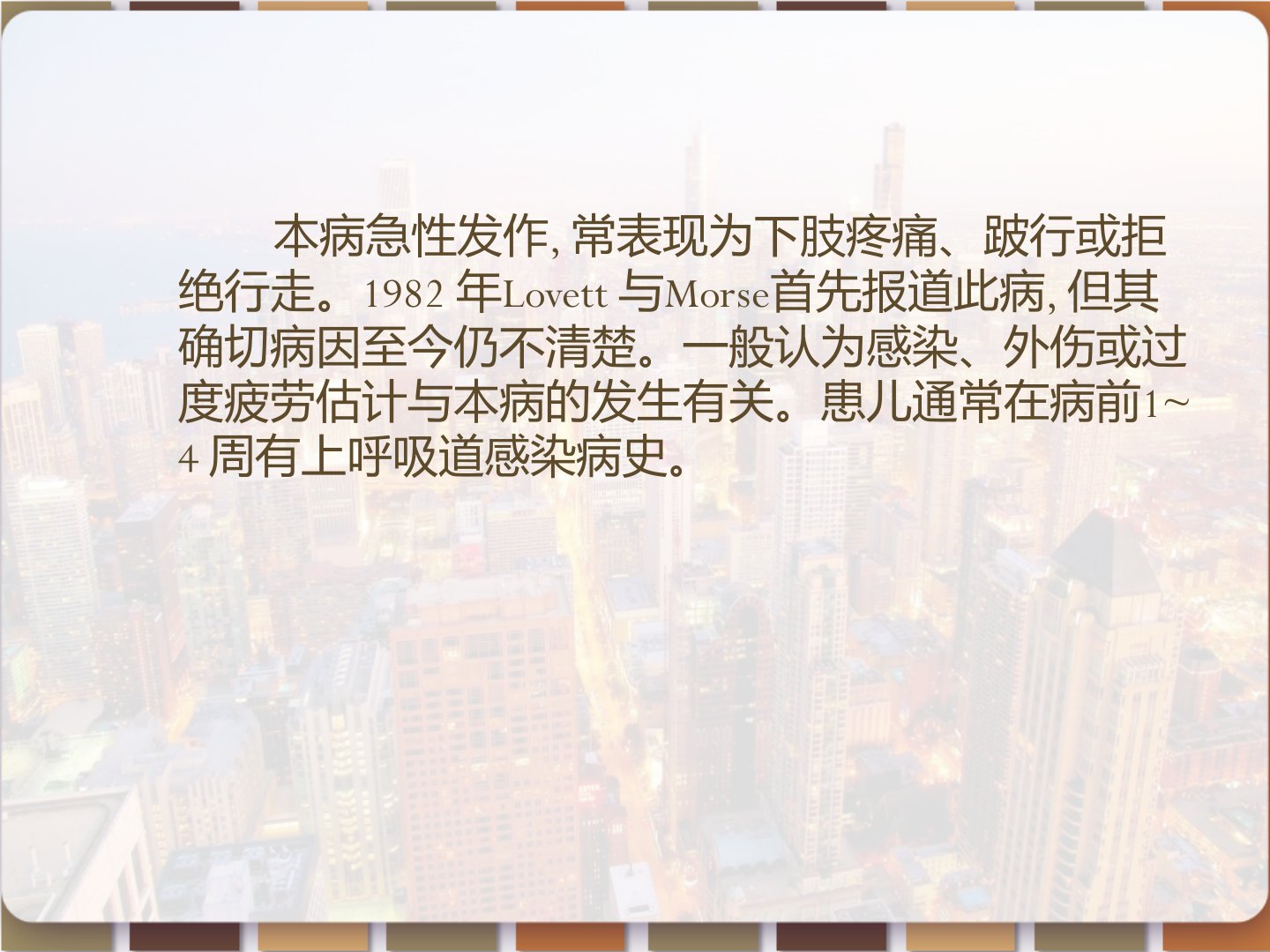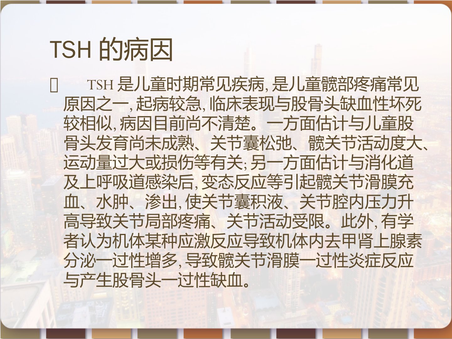 儿童急性髋关节滑膜炎常急性发作表现为下肢疼痛、跛行等1982年首次被报道病因不明或与感染、外伤、过度疲劳有关患儿病前多有上呼吸道感染史。其病因或与儿童股骨头发育不成熟、关节囊松弛、运动量大或损伤以及消化道和上呼吸道感染后变态反应等有关。关于儿童TSH与股骨头缺血性坏死的关系国外学者意见不一国内学者认为TSH或导致髋关节腔压力升高危及股骨头骨骺血供产生缺血性坏死但也有实验发现TSH30天后股骨头供血未减少。目前儿童TSH诊断标准明确但I期症状、体征及影像学检查不明显易被忽略故临床医生应警惕同时需与多种疾病鉴别诊断。TSH临床分四期治疗包括控制活动量、皮牵引、理疗及药物治疗等早期诊断治疗有巨大帮助。