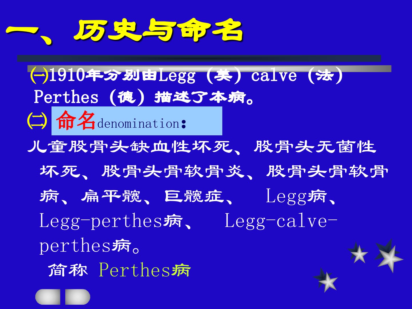 儿童股骨头缺血性坏死简称Perthes病1910年由Legg、Calve、Perthes分别描述多见于410岁男孩男女比例41双侧病例占10美欧发病率较高。该病真正致病原因尚未明确是世界骨科界研究热门课题之一。早期有炎症学说认为与骨感染有关但未得到病原菌证实也有学者提出该病与一过性滑膜炎关系密切。病因方面有学者提出动脉栓塞、骨髓内压增高、静脉瘀血等血管因素以及髋关节内压力增高、头血供不足等观点。病理上该病表现为骨骺多次缺血性梗死病程分为初期、缺血期、碎裂期、愈合期起病缓慢病程长有间歇性跛行与疼痛。临床表现包括下肢肌肉萎缩、内收肌痉挛等诊断依据病史、临床症状、X线等需与暂时性髋关节滑膜炎、髋关节结核等鉴别。治疗总原则是避免股骨头的机械压力、改善或恢复血循环手术治疗包括股骨上端截骨术等非手术方法采用特定位支架或行走石膏中远期随访优良率在90以上。