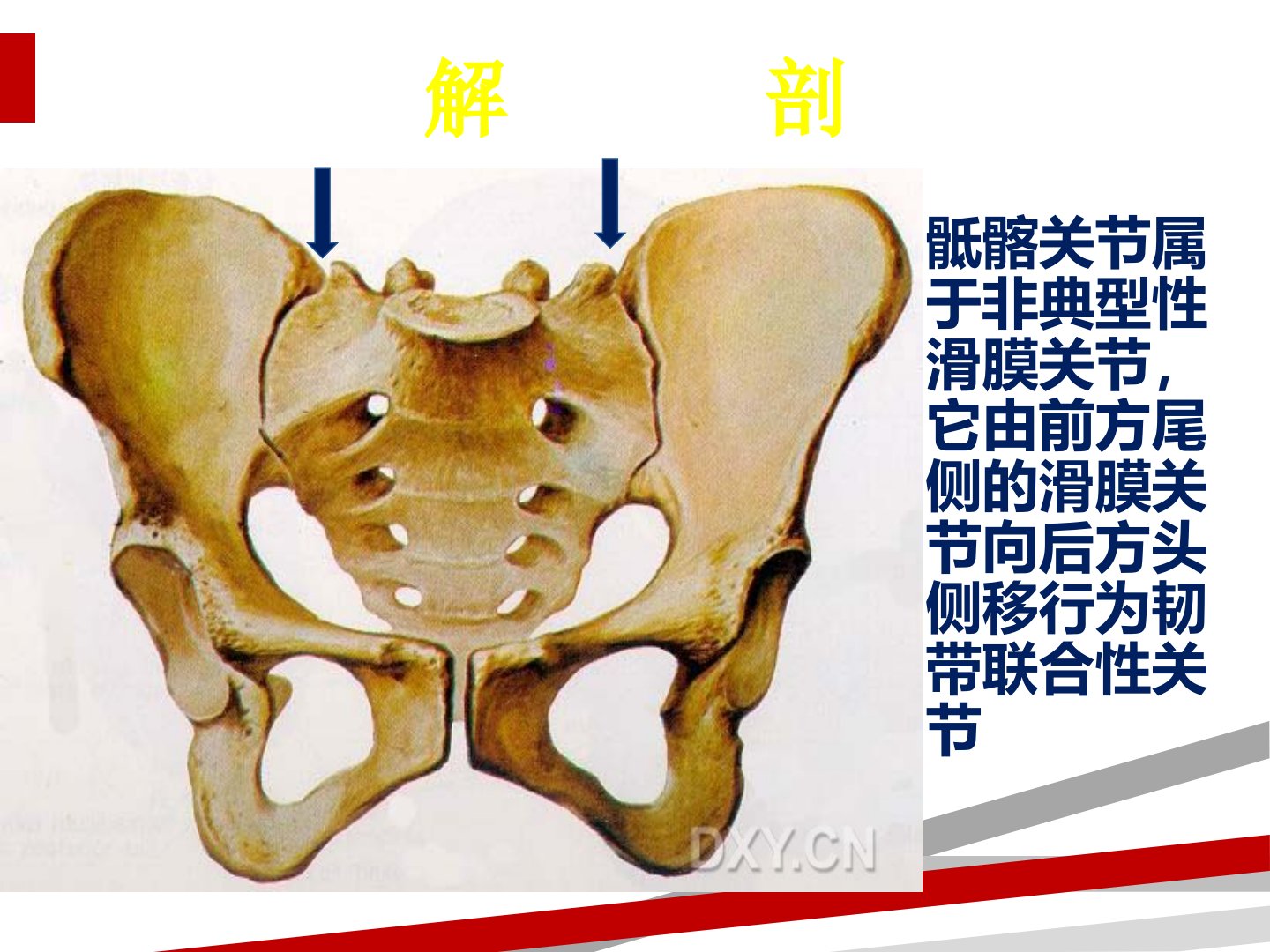 骶髂关节炎病因与治疗骶髂关节属于非典型性滑膜关节,它由前方尾侧的滑膜关节向后方头侧移行为韧带联合性关节解剖解剖由骶骨关节面与髂骨耳形关节面共同构成的,活动范围很小,是转达脊柱负重的滑膜关节。骶髂关节滑膜很少,耳状关节面的上方为粗糙的骨面,有坚强的骶髂骨韧带附着,前方及后方有坚强的骶髂前韧带及骶髂后韧带。女性由于生育的原因,骶髂关节开大,产后3-5个月复原。1)楔形的骶骨、粗糙的关节面、对称性的凸凹和强有力的骨间韧带.构成骶骨关节的稳定,从而也限制了关节的活动。2)腰背和下肢的肌肉系统,通过胸腰筋膜构成了骨盆的自身支架系统,有助于静态和动态时重力的传送。骶骨关节的特点:3)分为前下滑膜部与后上1...