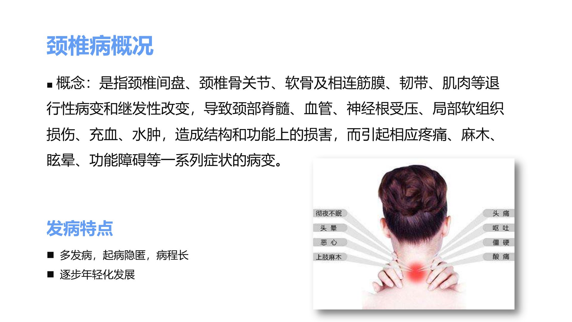 暴宏伶主任在承德医学院附属医院从颈椎病治疗角度探讨了刺灸法的灵活应用。颈椎病指颈椎间盘等退行性病变和继发性改变导致颈部脊髓等受压引发疼痛、麻木等症状。其发病特点为多发病、起病隐匿、病程长且逐步年轻化。临床分型包括颈型、神经根型(发病率最高症状包括颈痛、上肢麻木等)、脊髓型(以四肢运动障碍为主)、椎动脉型和交感型(存在争议症状多体征少)。治疗上西医除脊髓型需手术外其他多首选保守治疗。中医认为颈椎病属“眩晕”、“痹证”等范畴病位在颈部筋骨与督脉等经脉关系密切基本病机是筋骨受损、经络气血痹阻。中医治疗针刺与药物并用、循经与辩证兼顾、针刺与砭石同施、经穴与奇穴互补、刺络与滞针随症。刺灸法应用方面强调传统方法是基础演化方法要重视民间疗法须验证规范指南需完善。