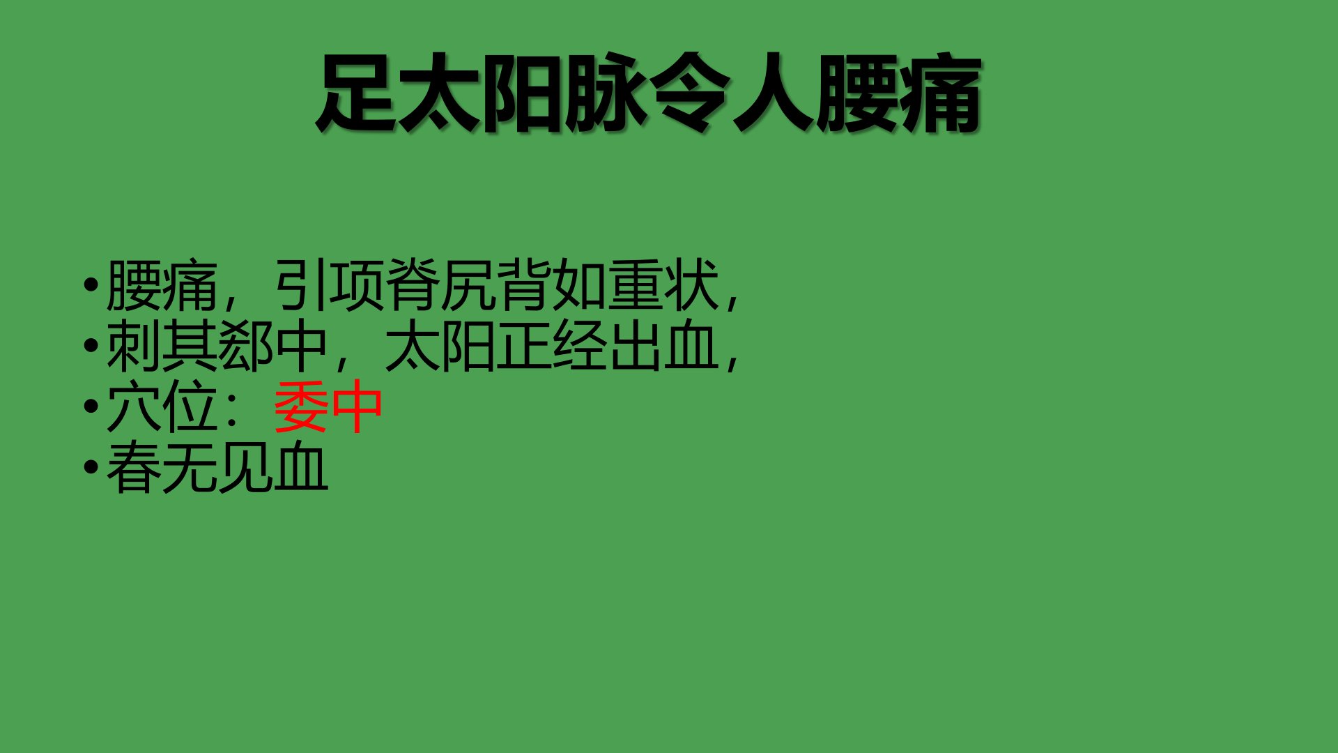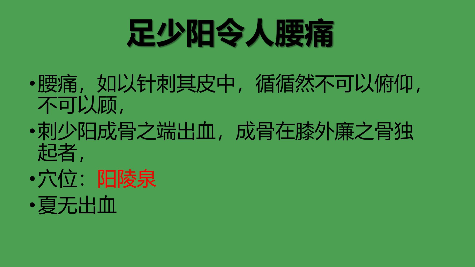刺腰痛篇黄帝内经治腰痛足太阳脉令人腰痛腰痛,引项脊尻背如重状,刺其郄中,太阳正经出血,穴位:委中春无见血足少阳令人腰痛腰痛,如以针刺其皮中,循循然不可以俯仰,不可以顾,刺少阳成骨之端出血,成骨在膝外廉之骨独起者,穴位:阳陵泉夏无出血阳明令人腰痛腰痛,不可以顾,顾如有见者,善悲刺阳明于(骨行胻)前三痏,上下和之出血穴位:足三里秋无见血足少阴令人腰痛腰痛,痛引脊内廉,刺少阴于内踝上二痏,穴位:复溜春无见血,出血太多,不可复也。厥阴之脉令人腰痛腰痛,腰中如张弓弩弦刺厥阴之脉,在腨shuàn踵zhǒng鱼腹之外,循之累累然同,乃刺之穴位:蠡沟其病令人善(有书无此字)言默默然不慧,刺之三痏足太阴令人腰痛...
