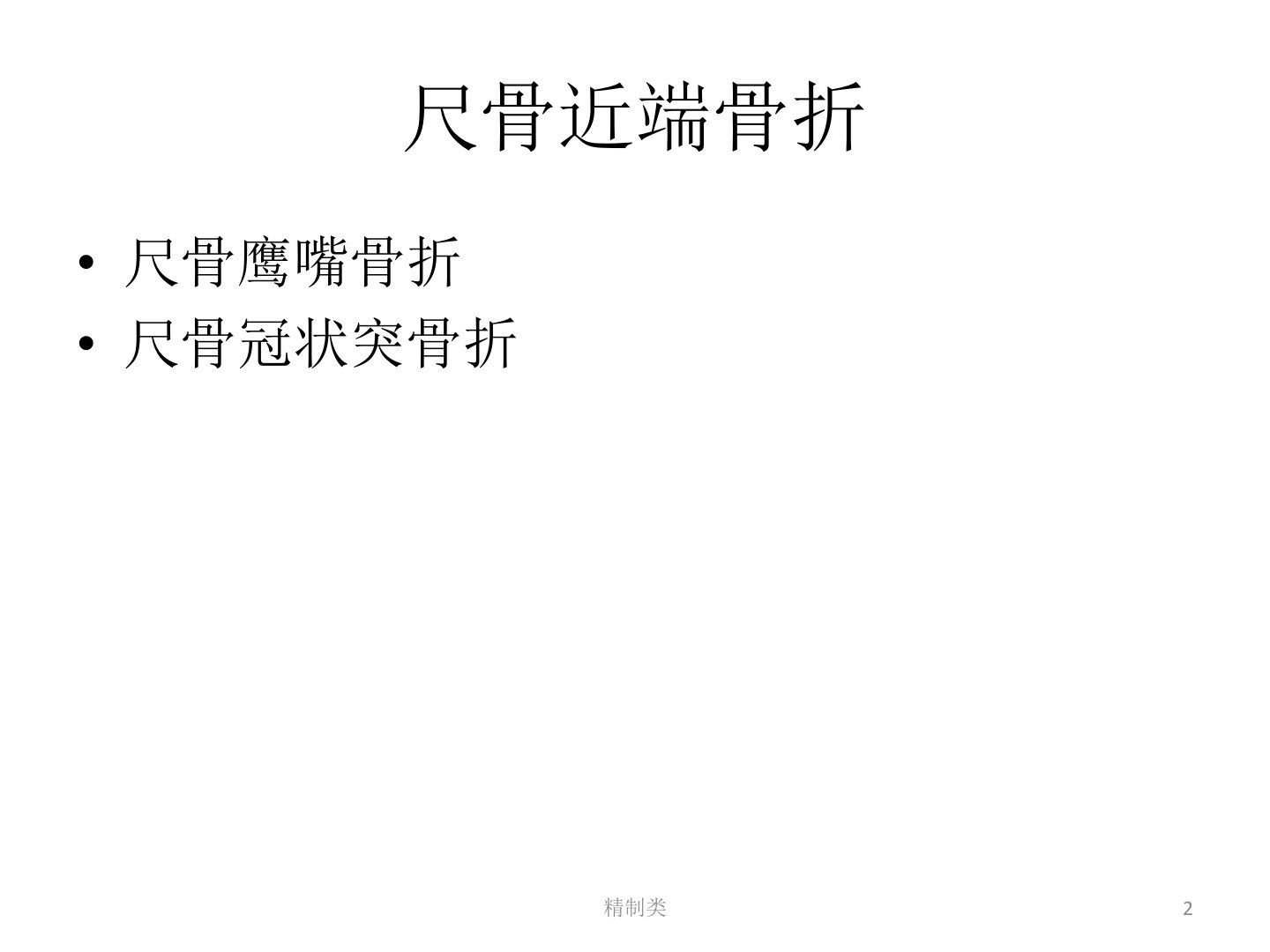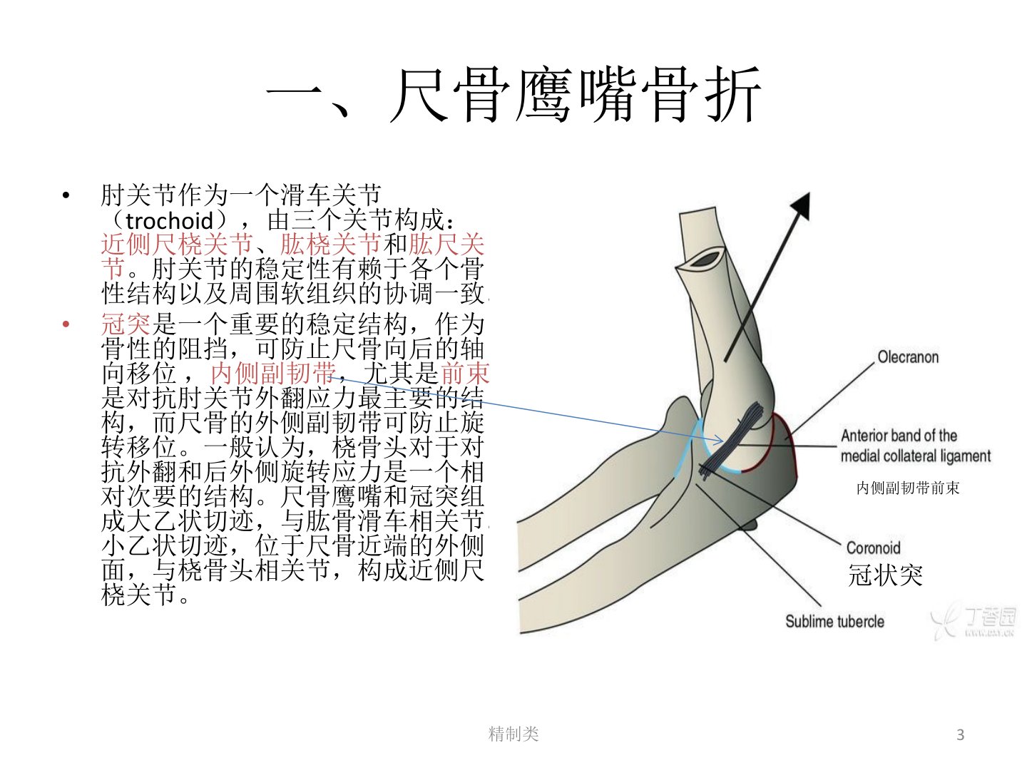 尺骨近端骨折罗公增精制类尺骨近端骨折尺骨鹰嘴骨折尺骨冠状突骨折精制类一、尺骨鹰嘴骨折肘关节作为一个滑车关节(trochoid),由三个关节构成:近侧尺桡关节、肱桡关节和肱尺关节。肘关节的稳定性有赖于各个骨性结构以及周围软组织的协调一致。冠突是一个重要的稳定结构,作为骨性的阻挡,可防止尺骨向后的轴向移位,内侧副韧带,尤其是前束,是对抗肘关节外翻应力最主要的结构,而尺骨的外侧副韧带可防止旋转移位。一般认为,桡骨头对于对抗外翻和后外侧旋转应力是一个相对次要的结构。尺骨鹰嘴和冠突组成大乙状切迹,与肱骨滑车相关节。小乙状切迹,位于尺骨近端的外侧面,与桡骨头相关节,构成近侧尺桡关节。冠状突内侧副韧带前束精...