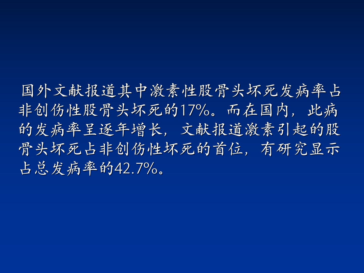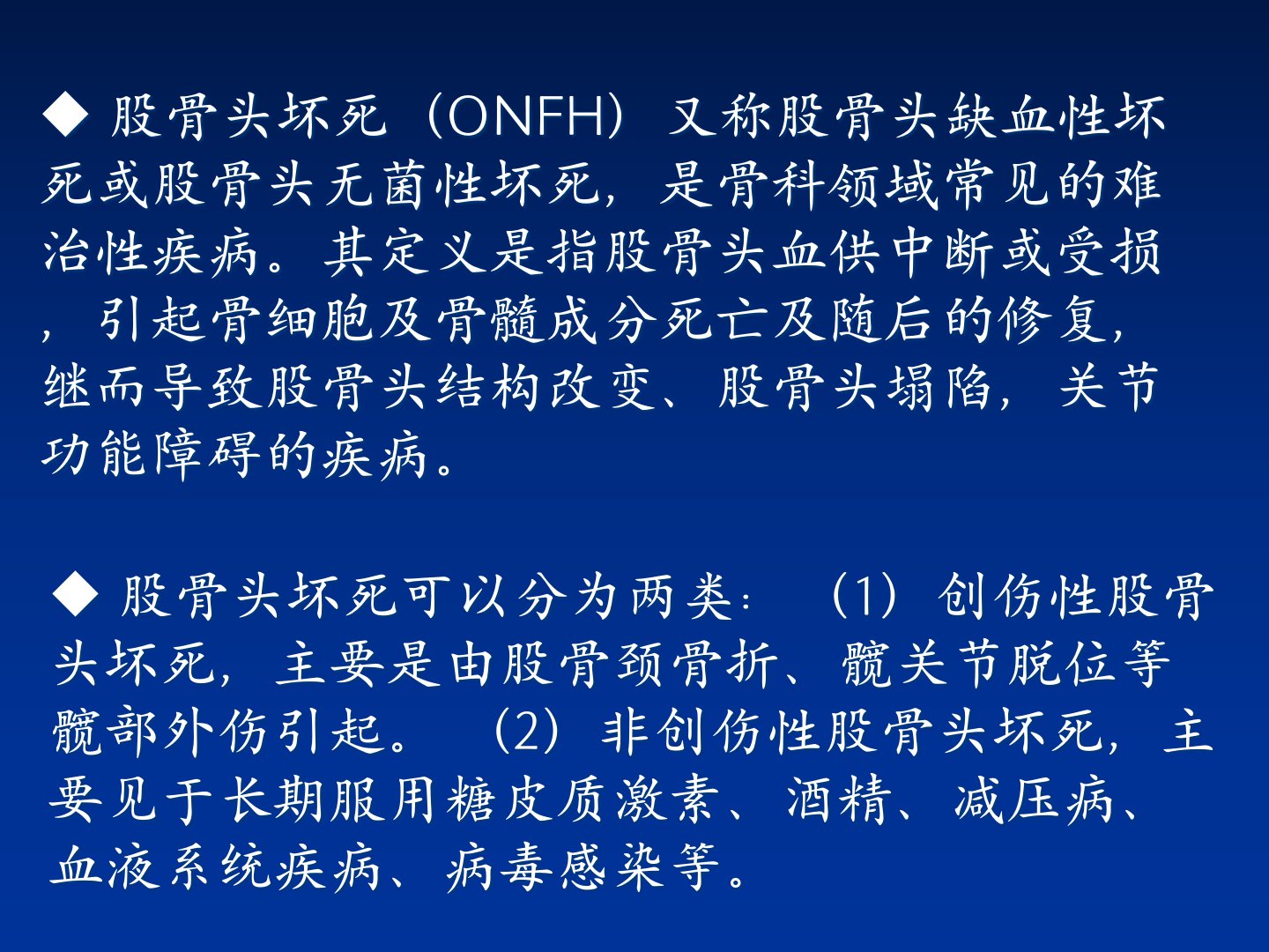 成人股骨头坏死(ONFH)是骨科难治性疾病由血供中断或受损引起可分为创伤性和非创伤性两类后者多与激素、酒精等因素有关国内激素引起的发病率较高。诊断标准综合了临床症状、X线片、核素扫描、MRI和骨活检等多方面信息符合两条或两条以上主要标准可确诊。分期多采用Ficat、Steinberg与ARCO分期用于指导治疗。治疗目的是改善血液循环、阻止骨质坏死、促进骨再生防止关节软骨退行性变和股骨头塌陷方法分为非手术和手术治疗。非手术治疗包括中医中药、西药、介入治疗等适用于早期患者。手术治疗方法多样包括髓芯减压、截骨、股骨头成形、骨移植、股骨头表面置换、人工关节置换、钽棒植入等选择取决于疾病分期和病变范围。ONFH确切发病机制尚未阐明治疗方法虽多但无一种适应证合理、疗效确切早期诊断和有效治疗对防止疾病进展至关重要。