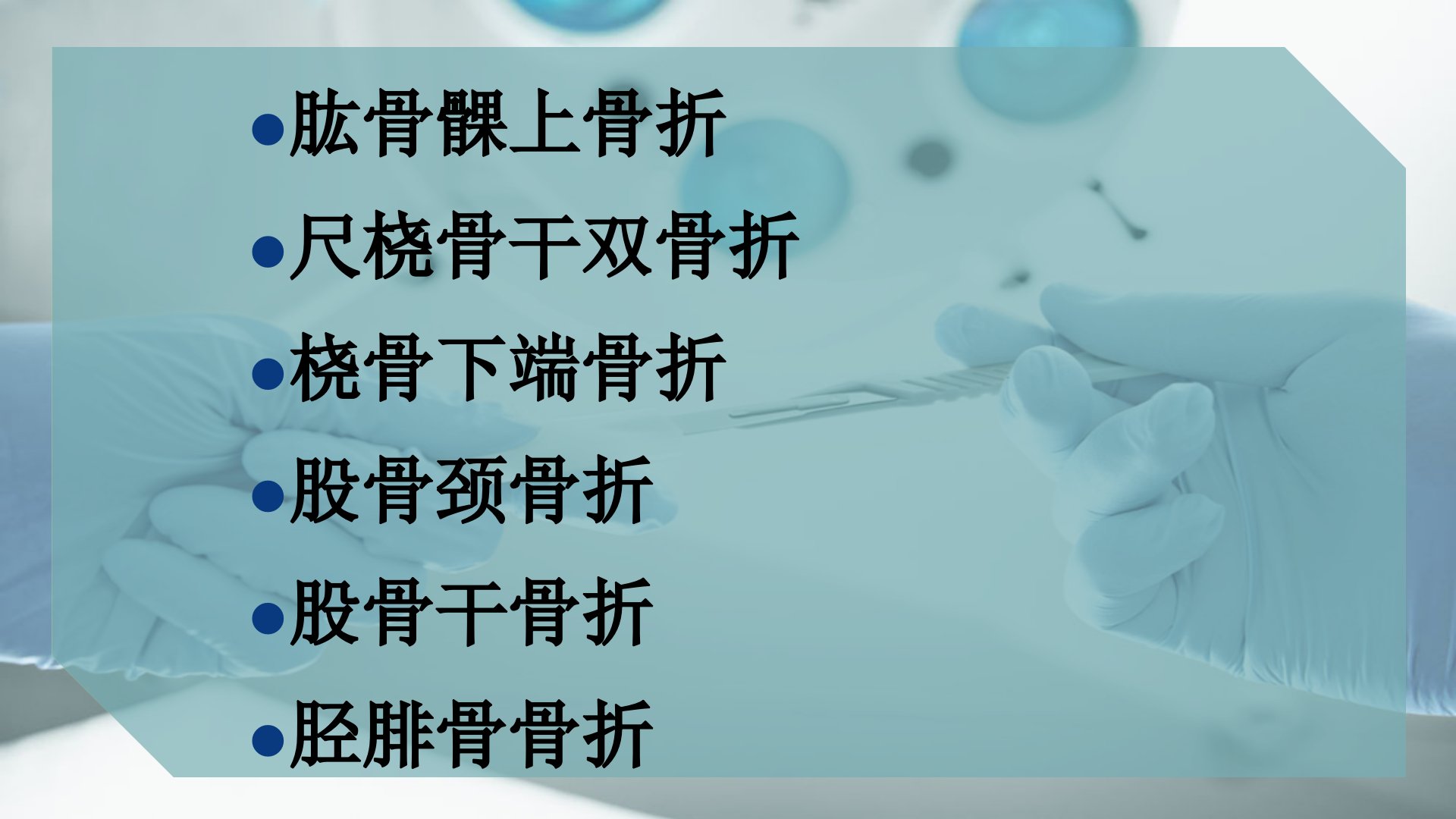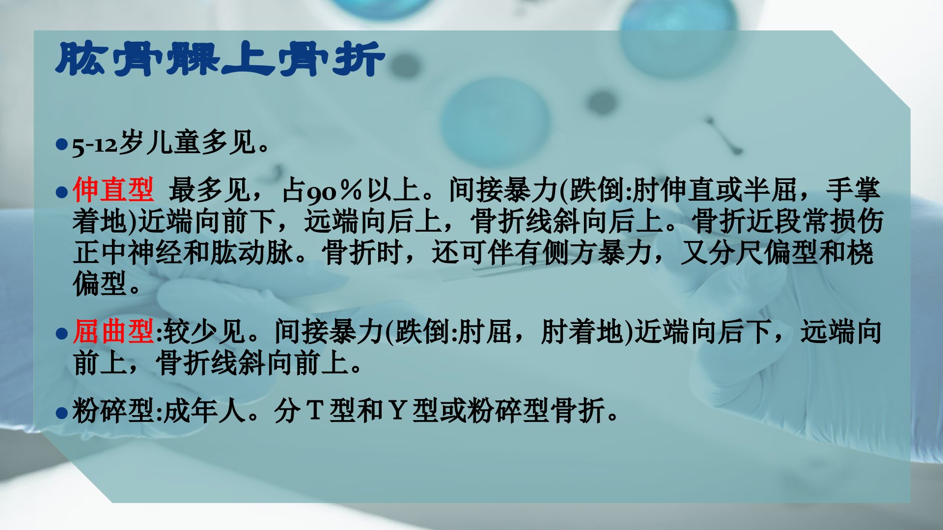 常见四肢骨折学习摘要四肢骨折是外科常见病症涉及多种类型。肱骨髁上骨折多见于512岁儿童伸直型占90以上由间接暴力导致骨折近段常损伤正中神经和肱动脉儿童外伤后要注意有无血管神经损伤其并发症包括血管神经损伤、缺血性肌挛缩、前臂骨筋膜室综合症和肘内翻等。桡骨下端骨折多发生于老年妇女分伸直型(Colles骨折)和屈曲型(Smith骨折)以手法复位小夹板或石膏外固定为主。股骨干骨折多见于青壮年由直接、间接或旋转暴力导致中下13交界处为最多发部位移位情况下可能损伤腘动脉、坐骨神经。股骨颈骨折以老年女性较多治疗重难点是骨折不愈合和股骨头缺血性坏死。胫腓骨干骨折是四肢最常见骨折之一多由直接或间接暴力导致胫骨上13骨折易压迫腘动脉中13骨折易骨筋膜室综合征中下13骨折易骨延迟愈合或不愈合。