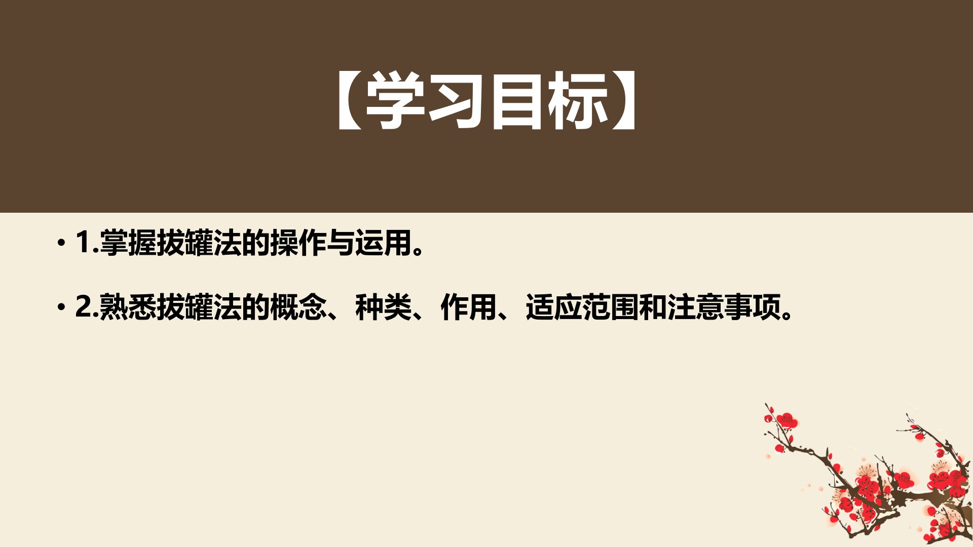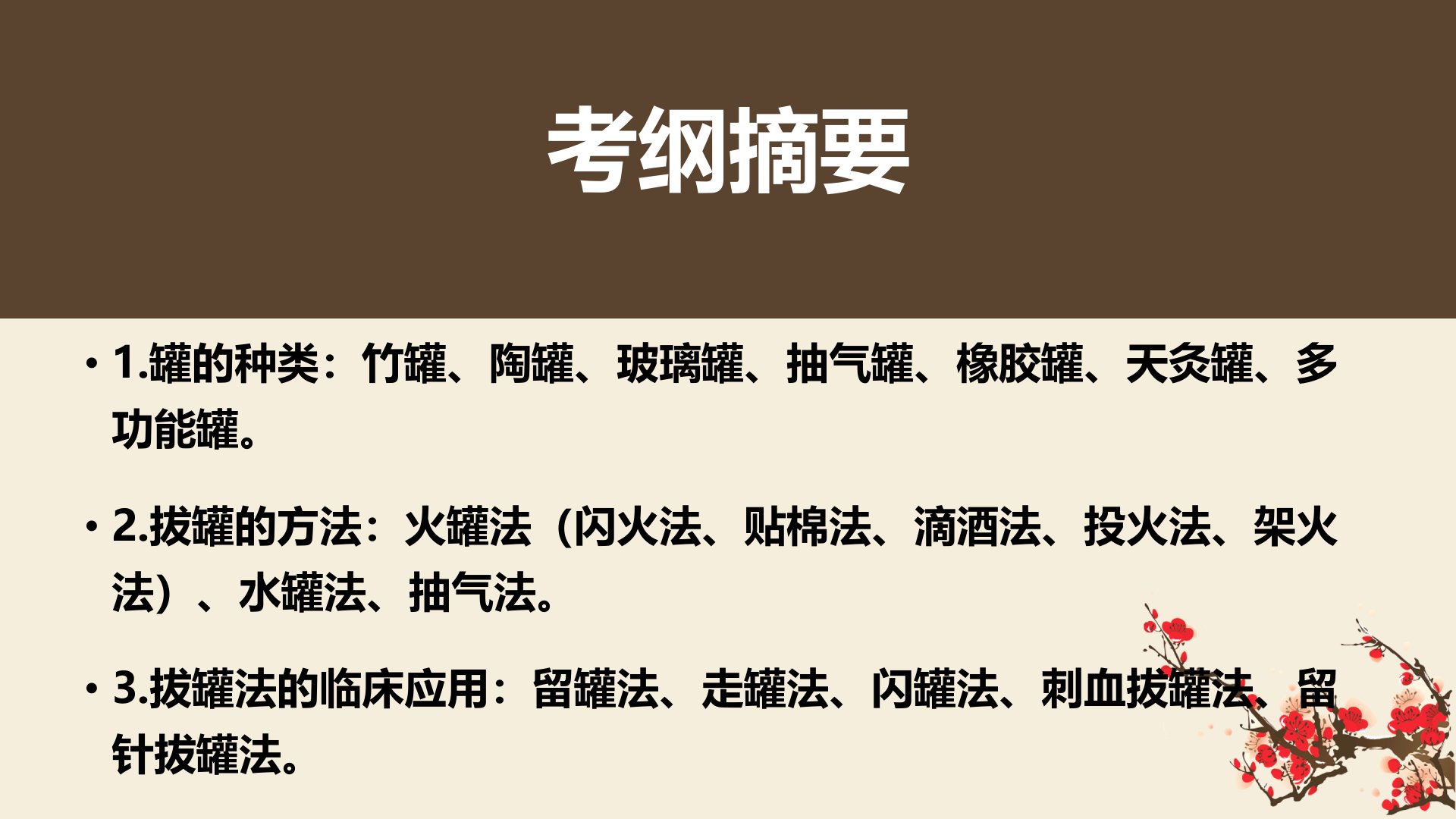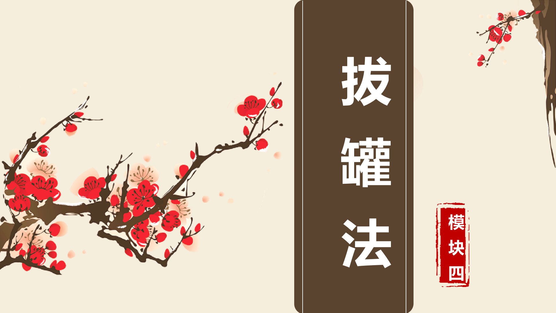 拔罐法模块四【学习目标】1.掌握拔罐法的操作与运用。2.熟悉拔罐法的概念、种类、作用、适应范围和注意事项。考纲摘要1.罐的种类:竹罐、陶罐、玻璃罐、抽气罐、橡胶罐、天灸罐、多功能罐。2.拔罐的方法:火罐法(闪火法、贴棉法、滴酒法、投火法、架火法)、水罐法、抽气法。3.拔罐法的临床应用:留罐法、走罐法、闪罐法、刺血拔罐法、留针拔罐法。拔罐法的概念与发展一、拔罐法的概念拔罐疗法又称“吸筒疗法”“火罐气”,古称“角法”。它是以杯罐为工具,利用燃烧、抽气等方法,排去罐内的空气以造成负压,使之吸定于所选腧穴或一定部位上,从而使局部皮肤充血、瘀血,以达到防治疾病目的的一种方法。二、拔罐法的起源与发展拔罐疗...