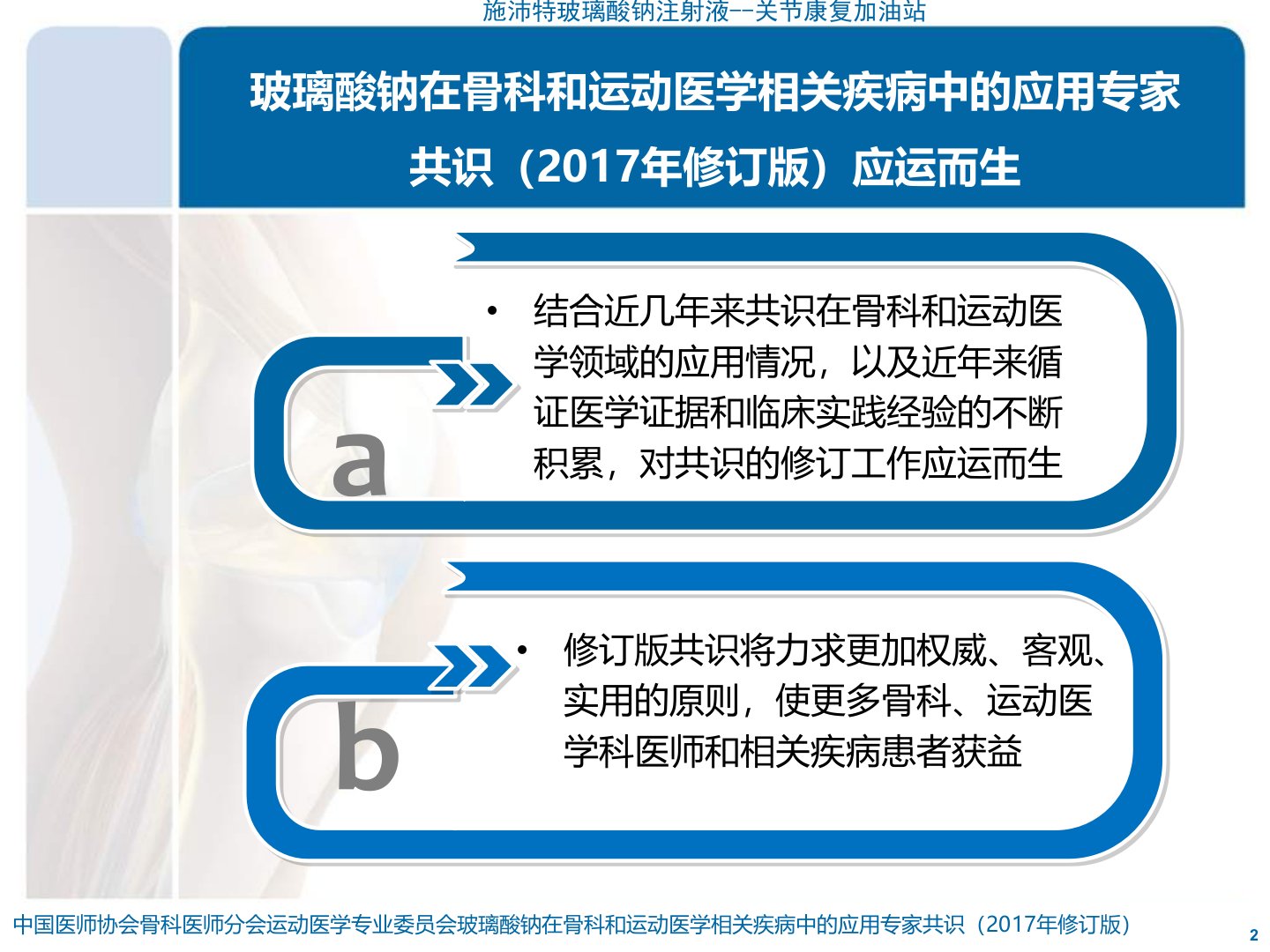 《玻璃酸钠在骨科和运动医学中的应用指南解读》摘要《玻璃酸钠在骨关节炎治疗中的应用专家共识(2012年版)》广受好评中国医师协会骨科医师分会运动医学专业委员会结合循证医学证据和临床实践经验于2017年修订发布了新版共识。玻璃酸钠(HA)广泛分布于细胞外基质有内源性和外源性两种可改善关节疼痛机制包括保护软骨细胞、抗炎、机械润滑、软骨下骨保护、镇痛等。新版共识新增促进蛋白聚糖和糖胺聚糖合成、保护半月板两大机制对润滑和镇痛机制进行了更新。HA安全性良好不良反应发生率低不同来源的HA均安全有效交联HA的半衰期较长。新版共识推荐HA用于大关节OA非急性肿胀期可缓解疼痛、改善关节功能还新增了多种适应症。与国外共识相比国内外均认为HA是轻度至中度关节OA的有效治疗方法但国外指南推荐意见存在差异。HA还可用于冻结肩、肩峰下撞击综合征等多种骨科及运动医学相关疾病。新增对禽类及蛋类过敏者为禁忌证且不建议HA与糖皮质激素、局麻药混合使用。