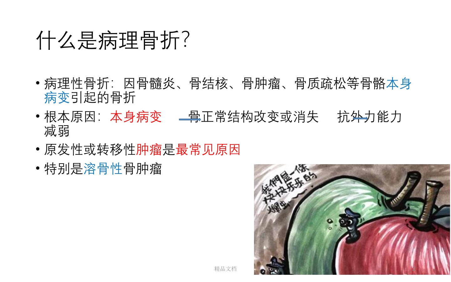病理性骨折由骨骼本身病变引发如骨髓炎、骨结核、骨肿瘤、骨质疏松等导致骨正常结构改变或消失抗外力能力减弱其中原发性或转移性肿瘤特别是溶骨性骨肿瘤是最常见原因。根据x线表现病理性骨折可分为无错位、轻微错位、明显错位及骨结构变形四类同时还可根据原发病变性质分为良性型和恶性型。检查方面需详细了解病史进行普通平片、骨扫描等影像学检查以及验血查肿瘤标记物。治疗需明确病因对因治疗如切除或刮除局部良性肿瘤并植骨广泛肿瘤则需截肢;恶性肿瘤无全身转移时可酌情手术有转移则考虑药物或放射疗法并局部固定。骨质疏松是病理性骨折的重要原因防治药物包括维生素D及衍生物、二膦酸盐等。预防上需针对原发病因治疗同时采取防跌倒计划包括家庭环境指导、正确使用拐杖及助行器等。