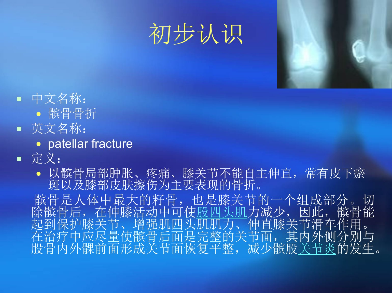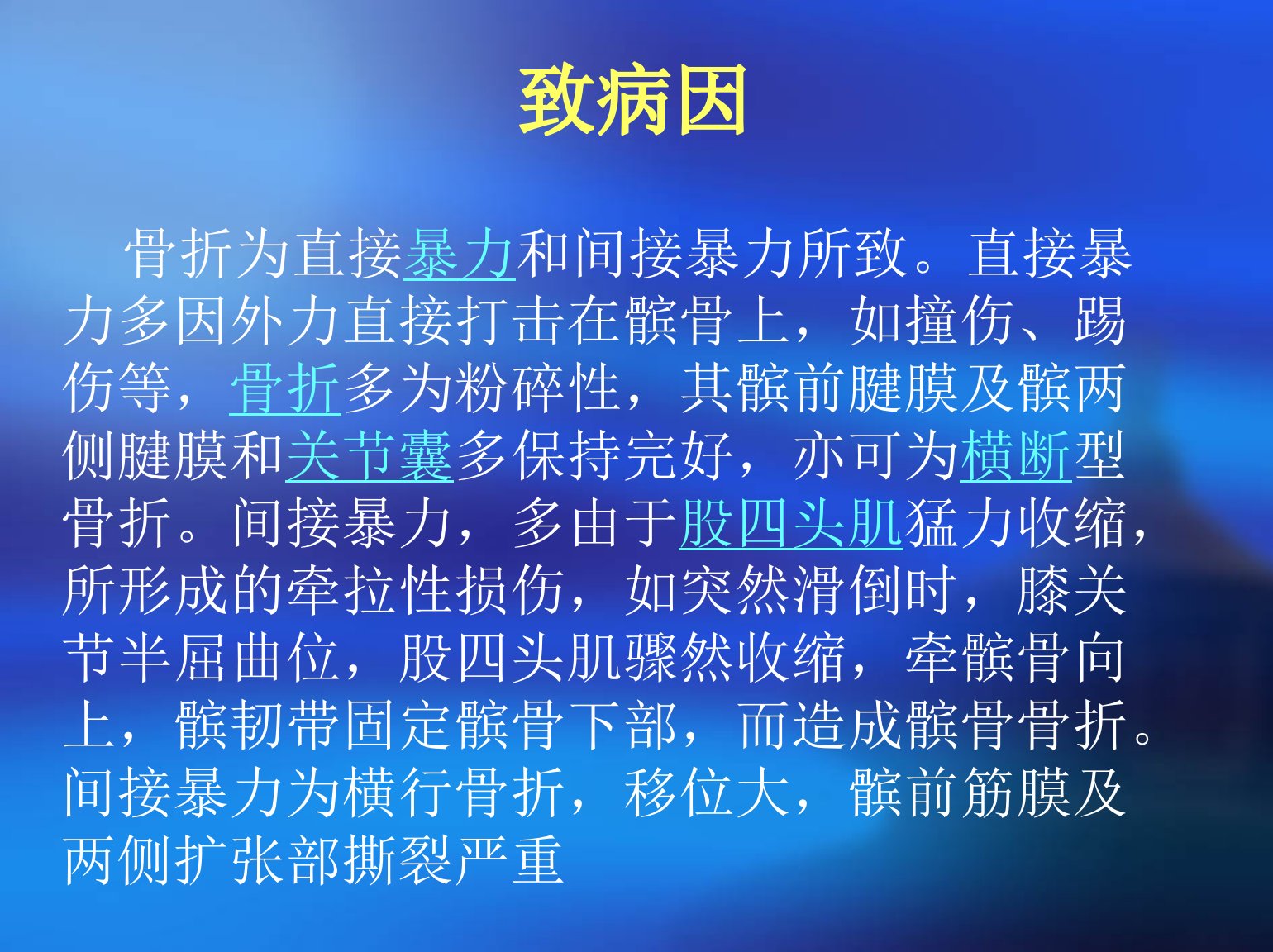髌骨骨折以局部肿胀、疼痛、膝关节不能自主伸直、皮下瘀斑及膝部皮肤擦伤为主要表现。髌骨是膝关节重要组成部分能保护膝关节、增强肌四头肌肌力。致病因有直接暴力和间接暴力前者多因外力直接打击髌骨多为粉碎性骨折;后者多由于股四头肌猛力收缩所形成的牵拉性损伤多为横行骨折移位大。症状包括膝关节疼痛不能伸直负重、局部压痛肿胀等伤后6小时是治疗最佳时机。鉴别诊断时要考虑股四头肌骨附着部或髌韧带髌骨附着部损伤的可能并注意除外二分髌。治疗措施包括石膏固定、切开复位固定等。术前需评估服药史、疾病史等术后护理包括一般护理、患肢护理等术后19周需逐步进行功能恢复性练习要保证以最快的速度恢复正常的关节活动度同时不能忽视肌肉力量等训练。此外骨伤患者不宜多吃骨头、杏仁忌食醋。