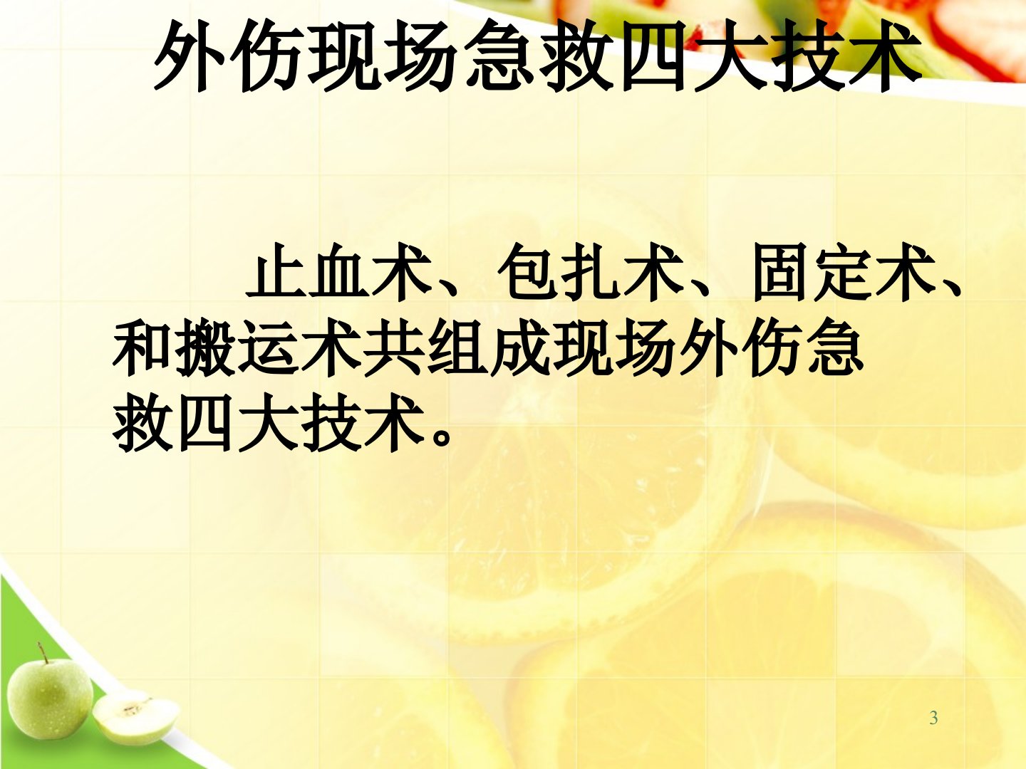 外伤现场急救有四大技术即止血术、包扎术、固定术和搬运术其中包扎骨折与固定尤为重要。包扎术可固定敷料、保护创面、防止污染还能止血止痛要求动作轻巧敷料无菌松紧适宜。包扎材料包括三角巾和轴带卷(绷带)。头部包扎有帽式、面具式、双眼包扎和头部十字包扎等适用于不同部位外伤。颈部包扎可用三角巾或绷带。躯干包扎包括胸部、背部、侧胸部、肩部、腋下和腹部包扎方法各异但均利用三角巾。四肢部包扎包括臀部、上肢下肢螺旋形、肘膝关节8字包扎以及手部和脚部包扎。固定术可减轻伤员痛苦防止骨折断端移动造成继发损伤。固定材料包括木制夹板、特制固定器等负压气垫因简便有效常被专业急救人员使用。固定方法包括头部、胸部、四肢和脊柱骨折固定等均要求动作轻巧、固定牢靠。异物刺入人体时应固定异物以防继发损伤。