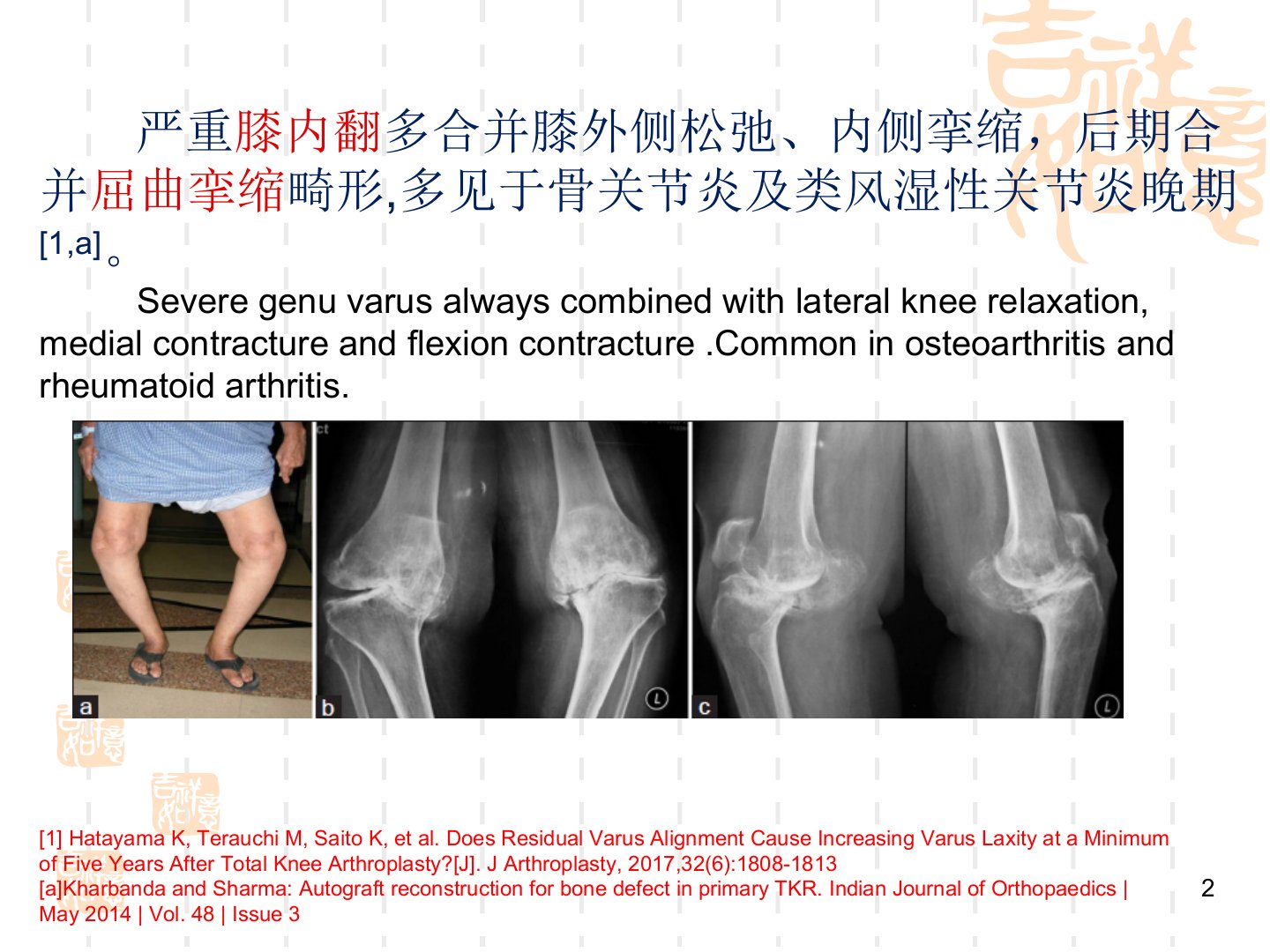 伴有骨缺损并膝关节脱位的初次全膝关节置换Primarytotalkneearthroplastywithbonedefectanddislocationoftheknee广东省中医院二沙岛医院骨科关节组许树柴,黄泽鑫,刘洪亮严重膝内翻多合并膝外侧松弛、内侧挛缩,后期合并屈曲挛缩畸形,多见于骨关节炎及类风湿性关节炎晚期[1,a]。Severegenuvarusalwayscombinedwithlateralkneerelaxation,medialcontractureandflexioncontracture.Commoninosteoarthritisandrheumatoidarthri...