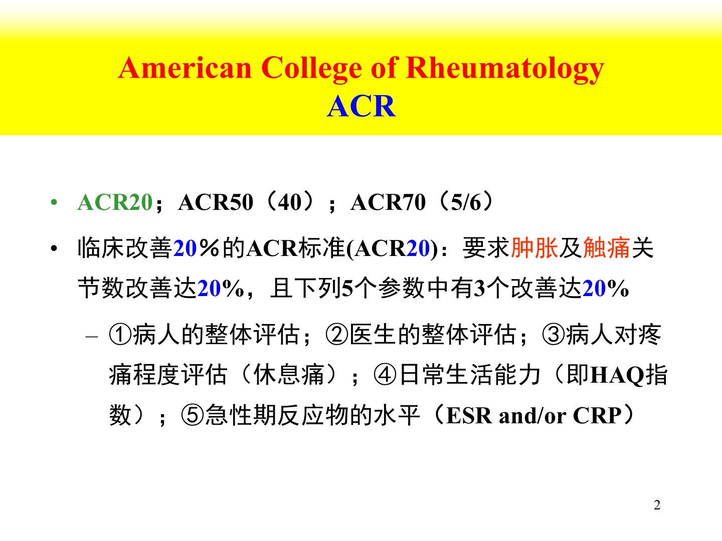 类风湿关节炎(RA)活动指标及疗效判断包括ACR20、ACR50(40)、ACR70(56)标准要求肿胀及触痛关节数改善达一定比例且病人整体评估、医生整体评估、病人疼痛程度评估、日常生活能力(HAQ指数)、急性期反应物水平等5个参数中有3个改善达20。HAQ评分包括8个大项20个问题总分03分。DAS28评估28个关节的肿胀和触痛是欧洲抗风湿联盟制定的改良疾病活动性标准。Sharp评分用于评估关节侵蚀和间隙狭窄。强直性脊柱炎(AS)活动指标包括VAS评分、AS核心指标(ASAS20)、BASDAI、BASMI、BASRI等。BASDAI评估AS活动度BASMI评估骨骼肌肉系统活动度BASRI对颈椎、腰椎、骶髂关节和髋关节分别评价。AS临床分期根据CRP、ESR和BASDAI等指标可分为相对静止期和活动期按功能评分BASFI、BASDAI、BASRI等可分为轻度、中度和重度国内习惯按病程分为早期、中期和晚期。