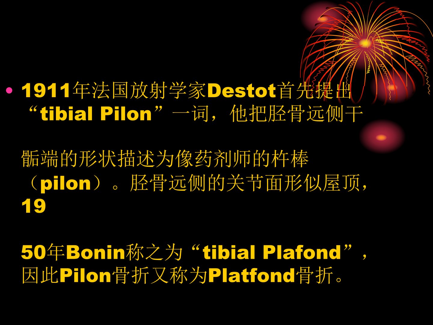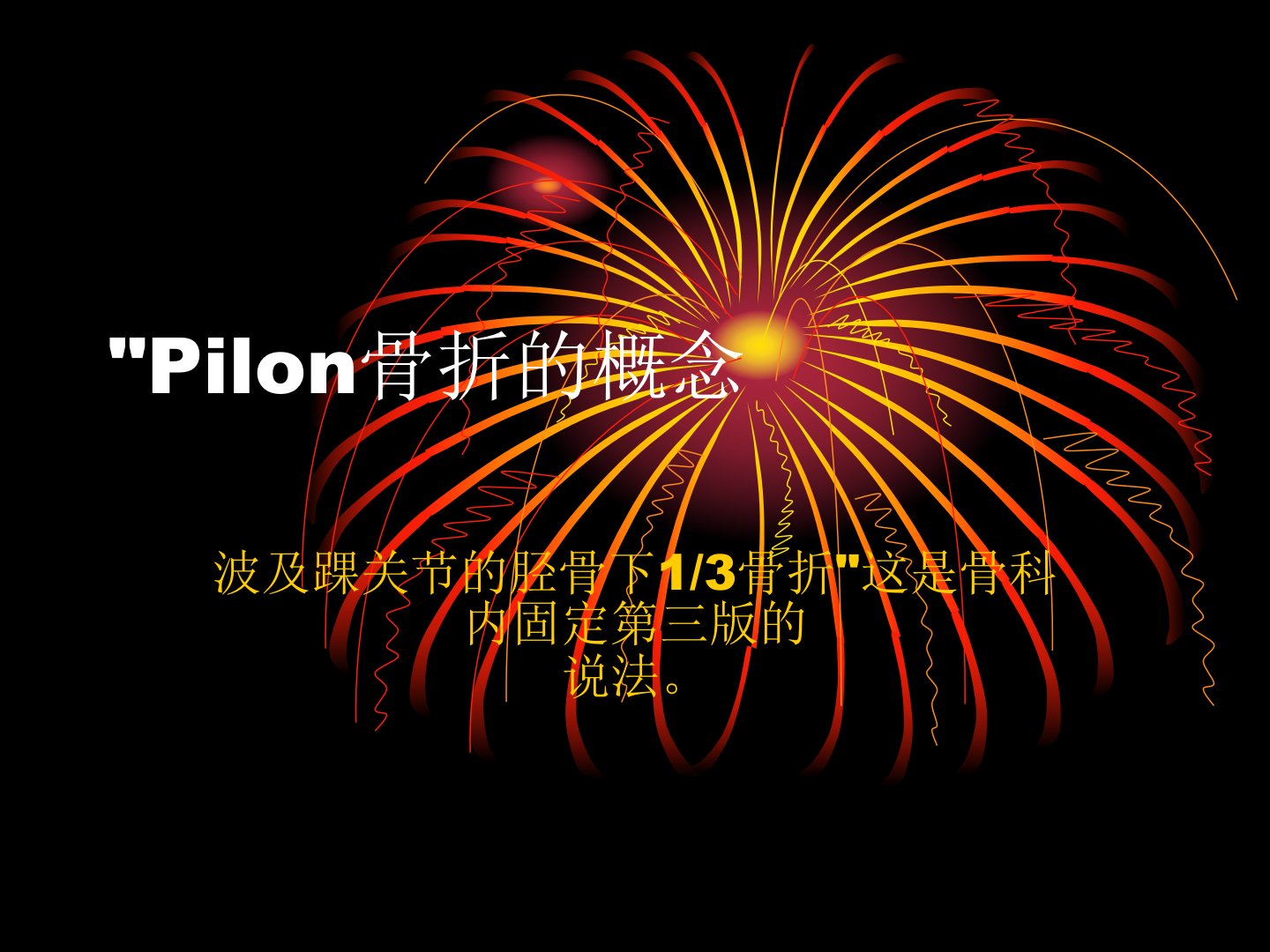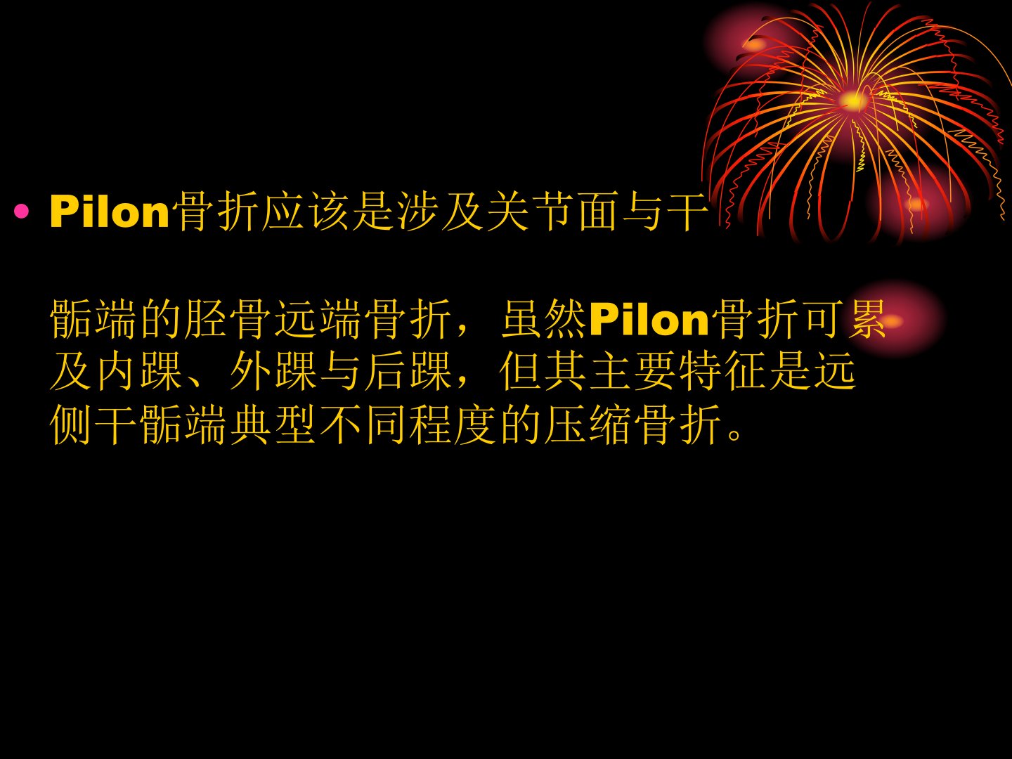 波及踝关节的胫骨下13骨折即Pilon骨折常因高处坠落、车祸等导致足的位置与骨折类型密切相关。损伤能量影响骨、软骨及软组织损伤程度高能量损伤预后差低能量损伤预后较好。骨折类型取决于轴向压缩与旋转剪切暴力7580的Pilon骨折患者合并腓骨骨折常由外翻或内翻剪切暴力所致。临床常用RuediAllgower分类系统AO分类系统描述更全面。Pilon骨折一期手术重建有重建腓骨、胫骨关节面、自体骨移植、支持接骨板支撑四项原则整复胫距关节面是关键。治疗原则是恢复腓骨长度、胫骨远端关节面、填补骨缺损、胫骨远端固定加内侧支撑。6小时内急诊手术解剖型钢板固定术后软组织坏死率低;12小时以上骨折先行跟骨牵引肿胀减退再手术。对于无明显皮质骨缺损的PILON骨折植骨并非必须。传统保守治疗效果不佳随着内固定技术发展有限内固定结合铰链式外固定器固定效果较好。