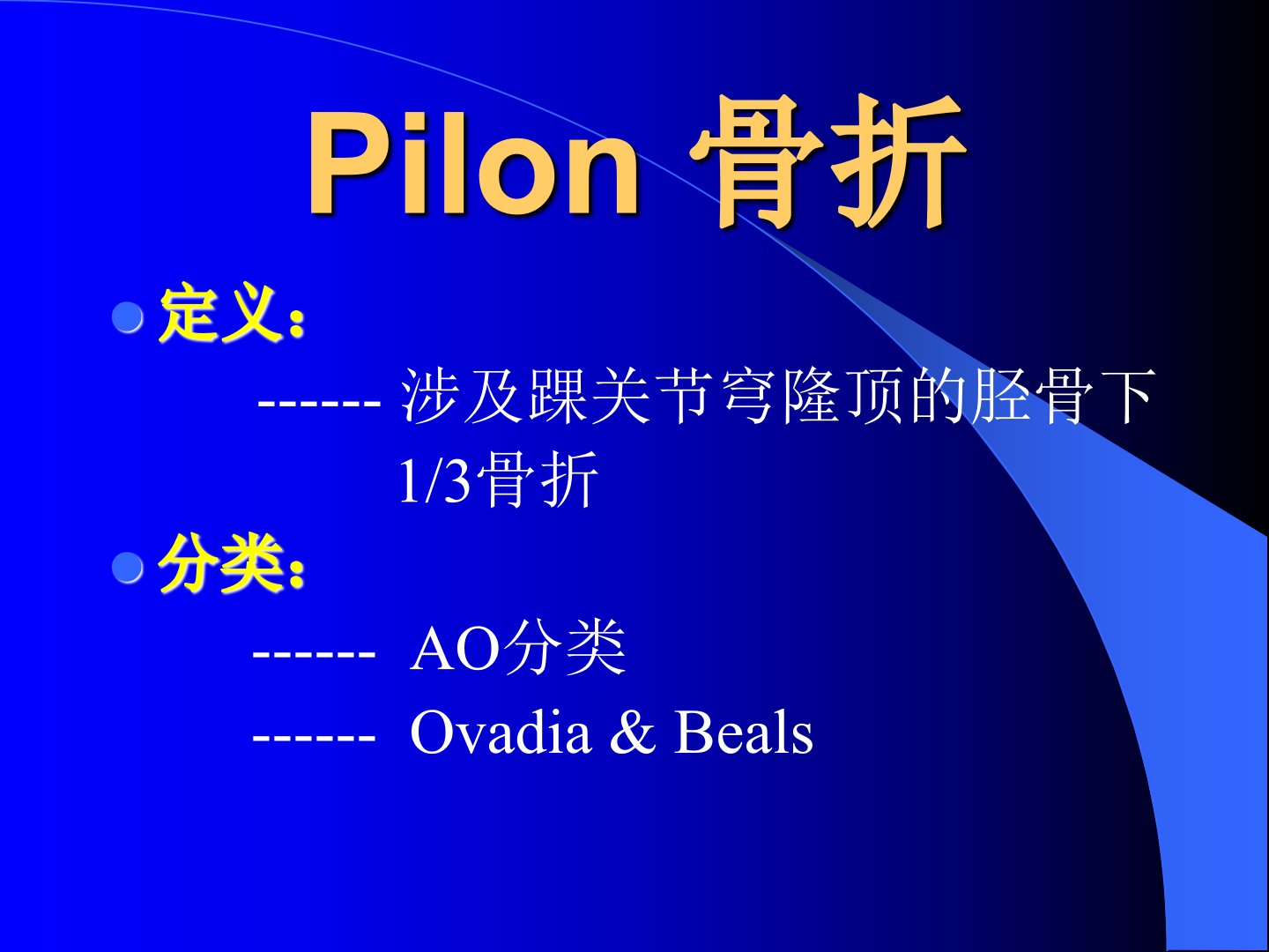 Pilon骨折摘要本文由上海市第六人民医院罗从风医生介绍Pilon骨折相关知识。Pilon骨折涉及踝关节穹隆顶的胫骨下13有AO分类、OvadiaBeals分类。高能量型Pilon骨折手术时机宜在伤后6小时内、肿胀出现前通过抬高患肢、骨牵引46天及药物治疗且保护软组织是手术成功关键。手术要点包括:切口选择二切口间距大于7cm;腓骨、关节面复位固定软骨下骨松质骨植骨;内侧支持钢板使用但单纯内固定有切口张力高、感染、血运破坏、骨不连等局限对高能量开放骨折效果不佳。高能量Pilon骨折对策是有限内固定结合外固定支架优点明显可减少伤口并发症、保护血运、实现满意复位固定。手术要点包括腓骨、关节面复位固定及利用外固定支架肌腱复位作用调整支架重建力线文中还提及病例1相关情况。