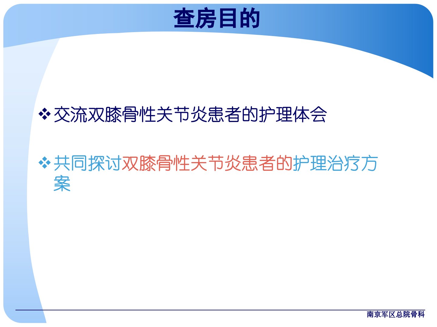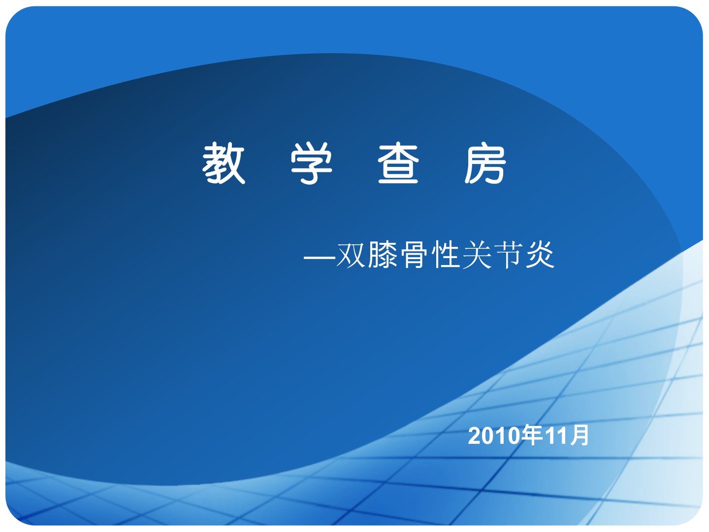 2010年11月南京军区总院骨科进行了双膝骨性关节炎教学查房查房目的为交流护理体会探讨治疗方案。查房内容包括:双膝骨性关节炎好发于中老年肥胖女性病因包括年龄、职业、肥胖等是关节软骨、关节结构的退行性变及继发于退行性变的软骨破坏或增生性变化引发的疾病。其临床表现包括发病缓慢、活动时疼痛加重、活动受限等。影像诊断常用核磁共振、骨扫描和平片。实验室检查包括血液检查、关节镜检查等。防治原则强调早治疗早预防通过功能锻炼维持关节功能推荐游泳、骑车等运动纠正负重过多、上下楼过多等不正确锻炼方法四步法功能锻炼以主动不负重练习为主。饮食方面建议高钙、高维他命D及多种维生素摄入肥胖患者应减轻体重。治疗原则为缓解症状、阻止疾病发展治疗方法有理疗、辅助工具、注射疗法、药物治疗及手术治疗。患者桑作琳71岁6年前出现双侧膝关节疼痛近两个月加剧查体示双侧膝关节局部压痛明显、肿胀膨大畸形、活动受限双膝摄片示双膝骨性关节炎后行左膝骨性关节炎表面置换术术后进行了气压治疗、抗生素治疗等护理措施包括体位护理、伤口引流管护理、功能锻炼。术前应开展患者教育普及疾病知识鼓励改变不良生活方式。术后疼痛是迫切解决的护理问题冰袋冷敷可减