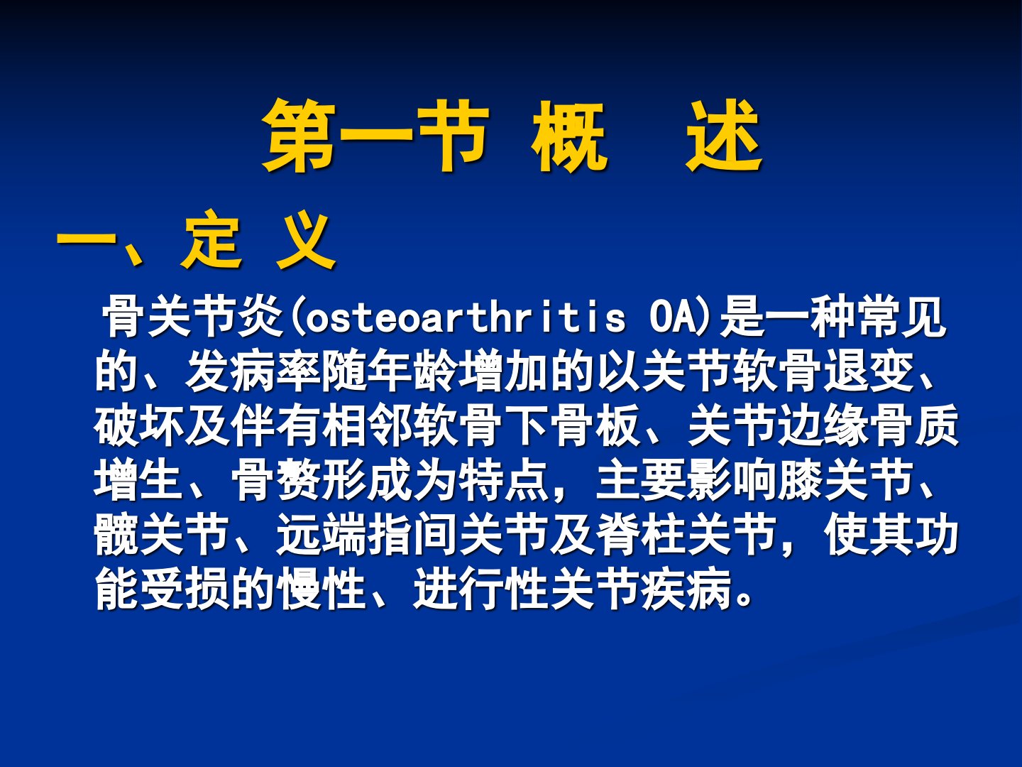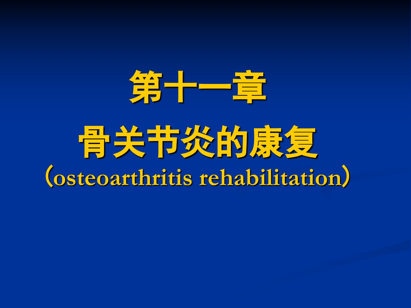 第十一章骨关节炎的康复摘要概述骨关节炎(OA)是随年龄增长关节软骨退变、破坏伴有骨质增生、骨赘形成的慢性关节病影响膝、髋等关节功能。OA相关概念包括骨关节病、退行性关节炎等。OA分为原发性和继发性两类。OA总患病率为1540岁人群患病率为1060岁以上达5075岁以上达80最终致残率为53。其分布存在性别、年龄、部位差异无显著种族差异但髋关节OA在白种人中较多膝关节OA在东方人中较多。病因包括一般性因素(年龄、性别、肥胖、营养)、遗传性因素、机械损伤性因素、免疫学因素等。发病机制有机械损伤学说、软骨免疫机制学说、细胞因子失衡学说等。病理涉及关节软骨、软骨下骨、滑膜、关节囊及周围肌肉。临床特点症状有关节疼痛、僵硬、膨大等体征包括压痛、关节摩擦感等实验室检查多正常影像学检查X线片、CT、MRI各有特点。诊断多采用美国风湿病学会1995年修订的标准。康复评定包括疼痛评定、肢体围度和关节周径测量、肌力评定、关节活动度测量、手功能评定、下肢功能评定、日常生活活动能力评定、生活质量评定。康复治疗目标是减轻疼痛、保护关节、恢复功能等。措施包括减轻关节负荷、物理因子治疗、运动疗法、关节松动技术、按摩针