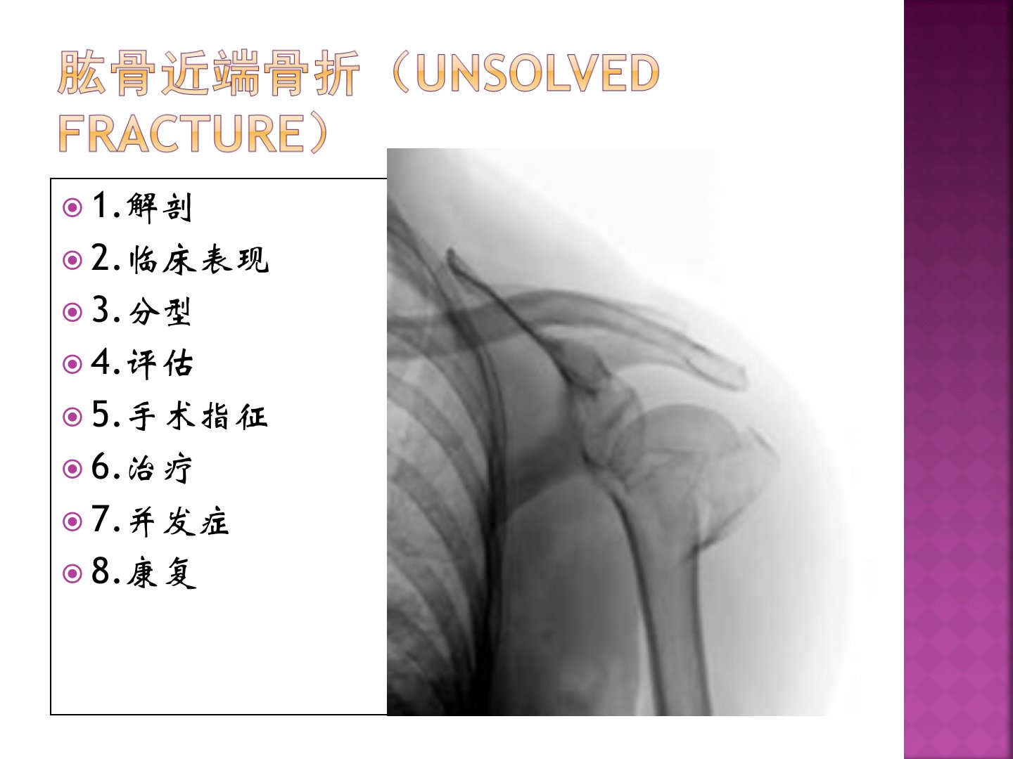 作为医生对肱骨近端骨折的认识与治疗需关注以下几点:肱骨头血供主要依赖旋肱前动脉肩袖中冈上肌血运最重要但与肱骨大结节相连处血运差为危险地带。Neer分类法按移位情况将骨折分为2、3、4部分其中4部分骨折时肱骨头游离且血供尽失需换假体。评估时X线片必不可少粉碎性骨折应做CT扫描。治疗上非手术治疗适用于稳定性骨折优良率达88包括手法复位、吊带悬吊等;手术治疗则包括经皮穿针、切开复位内固定及人工肩关节置换等手术指征取决于全身和局部损伤的情况、骨折的类型和稳定性等。研究显示手术内固定治疗组患者术后2年关节功能和生活质量更好但翻修率高。并发症方面非手术治疗可能损伤软组织导致骨折延迟愈合等手术治疗则可能损伤血管神经导致关节僵硬等。康复时非手术治疗的肱骨大结节骨折可坐位进行肱骨头压力锻炼同时要保证肱骨头和关节盂轴向一致。
