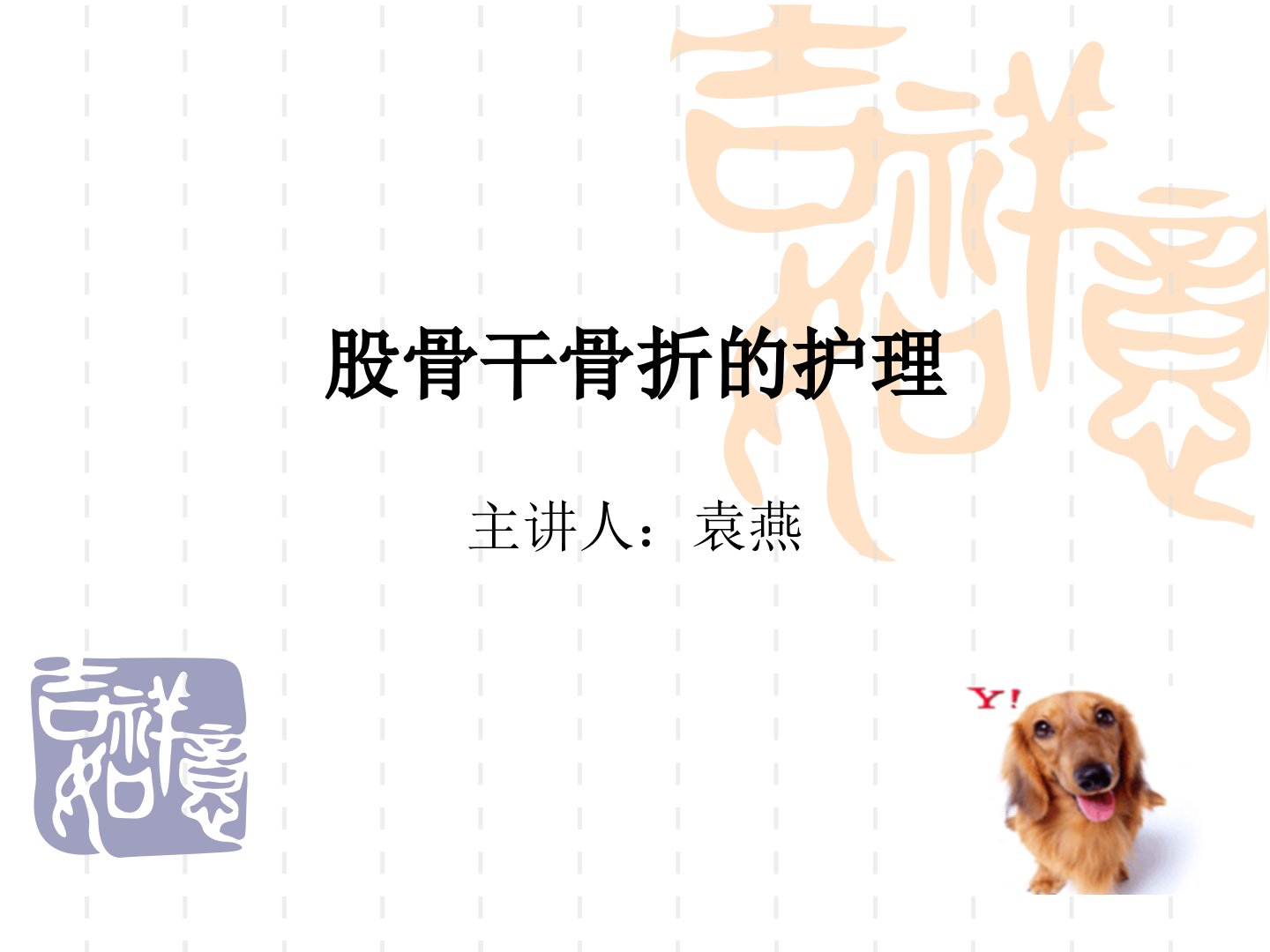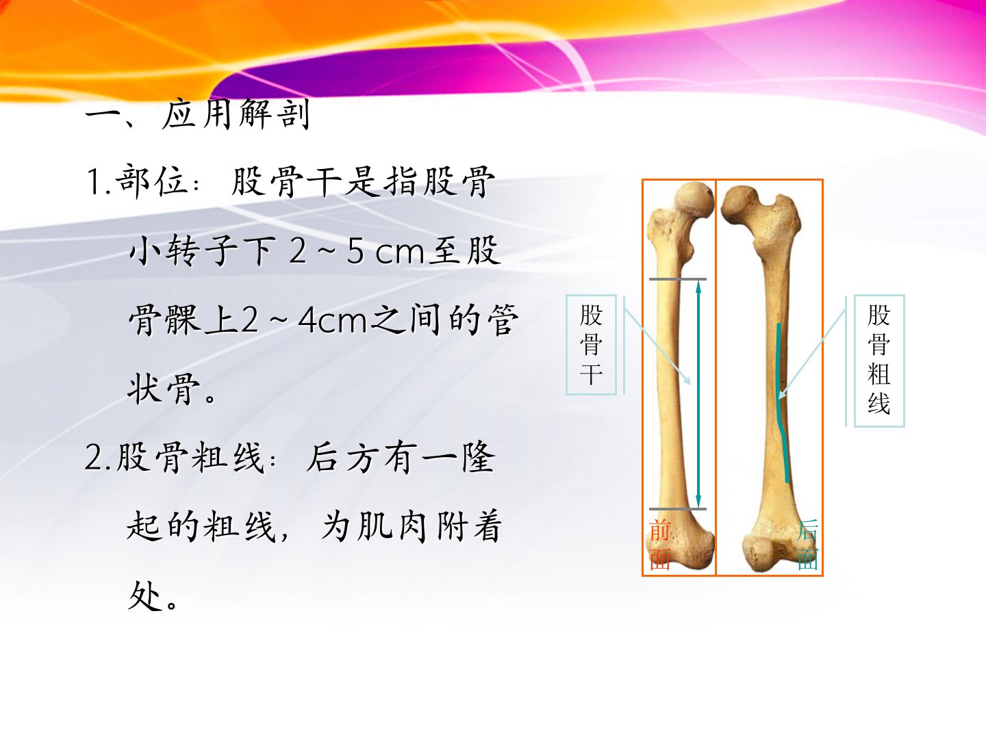 股骨干骨折的护理主讲人:袁燕一、应用解剖1.部位:股骨干是指股骨小转子下2~5cm至股骨髁上2~4cm之间的管状骨。2.股骨粗线:后方有一隆起的粗线,为肌肉附着处。股骨干股骨粗线3.骨干有轻度向前弯曲的弧度,有利于伸膝功能。4.其髓腔呈圆形,上、中1/3的内径大体一致,下1/3的内径较膨大。股骨干髓腔大小5.大腿部的血管神经⑴在大腿周围有股动脉及其分支分布。⑵坐骨神经在大腿后方行走。⑶在股骨干下1/3血管、神经紧贴骨骼,此处骨折易并发神经、血管损伤。股动脉坐骨神经二、病因股骨干骨折多见于儿童及青壮年,男多于女。㈠病因股骨干骨折多由强大暴力引起。直接暴力多引起横断或粉碎骨折,间接暴力多引起斜形或...