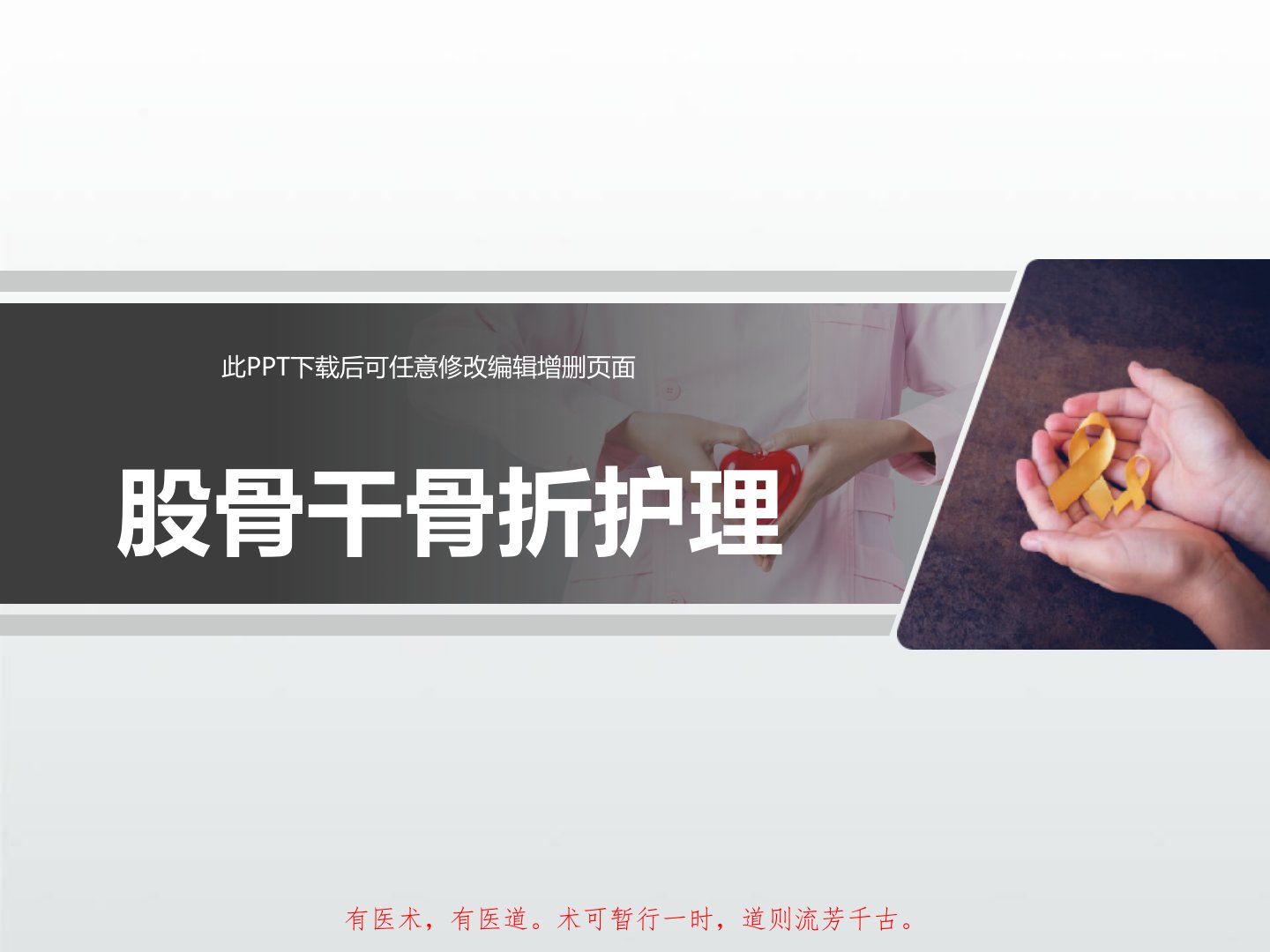 股骨干骨折护理摘要股骨干骨折指小转子下2—5cm至股骨髁以上2—4cm间骨折约占全身骨折46多由强大直接暴力(如汽车撞击)或间接暴力(如高处坠落)所致直接暴力多致横行、粉碎性骨折间接暴力多致斜形、螺旋形骨折儿童易发青枝骨折。临床表现多有严重外伤史局部疼痛肿胀、下肢功能丧失骨折多明显移位出现短缩、成角和旋转畸形。治疗方案分非手术和手术治疗。非手术治疗中骨牵引疗法因需长期卧床、并发症多多作为术前准备牵引时要注意患肢位置、测量下肢长度等。手术治疗要做好术前准备术后分阶段进行功能锻炼。护理方面要告诫病人畸形愈合危害指导正确扶拐。特殊情况如创伤性失血性休克要立即给予合适卧位、建立静脉通路等;急性肺栓塞时要协助病人平卧、清除呼吸道分泌物、建立静脉通道、快速止痛等。同时要严格执行口头医嘱制度与执行流程。