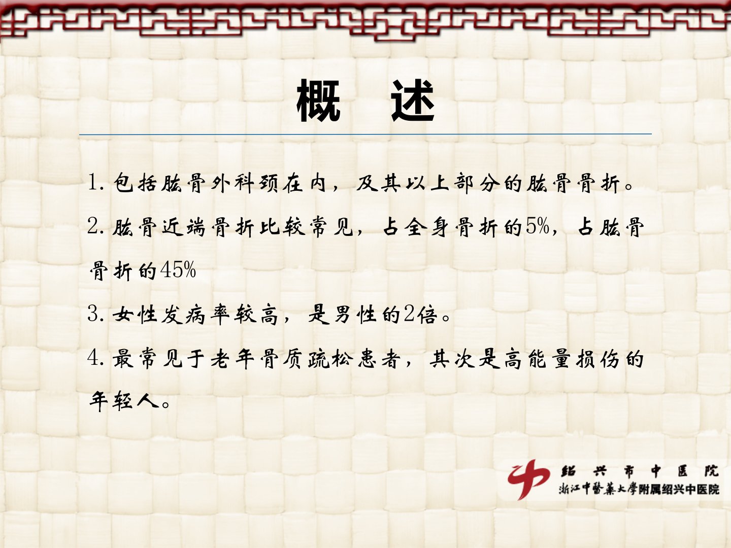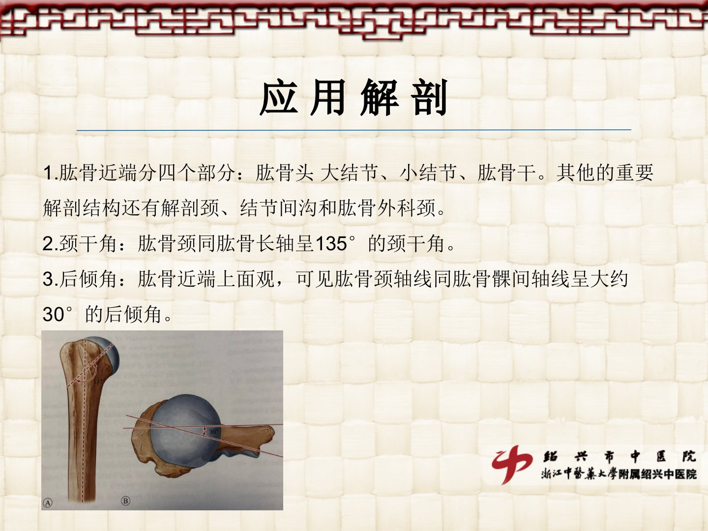 肱骨近端骨折包括肱骨外科颈在内及其以上部分的骨折比较常见占全身骨折的5肱骨骨折的45女性发病率是男性的2倍最常见于老年骨质疏松患者和高能量损伤的年轻人。肱骨近端分四部分:肱骨头、大结节、小结节、肱骨干还有解剖颈等重要结构。其血供主要来自弓状动脉预后与血供情况密切相关如解剖颈骨折预后不良肱骨头骨块上内侧干骺端保留长则血供良好。肱骨头中央和肱骨颈的骨小梁结构随年龄增长而疏松内固定时螺钉尖部应止于软骨下骨510mm。骨折由间接、直接暴力或病理性原因导致分型采用Neer分型。影像学评估包括X线、CT、MRI。治疗分保守治疗和手术治疗手术治疗有闭合复位经皮穿刺固定、切开复位内固定、髓内钉内固定、肱骨头置换等方式。手术时需注意钢板螺丝放置位置尽可能恢复肱骨后倾角和颈干角注重肩袖修复和内侧皮质复位固定。