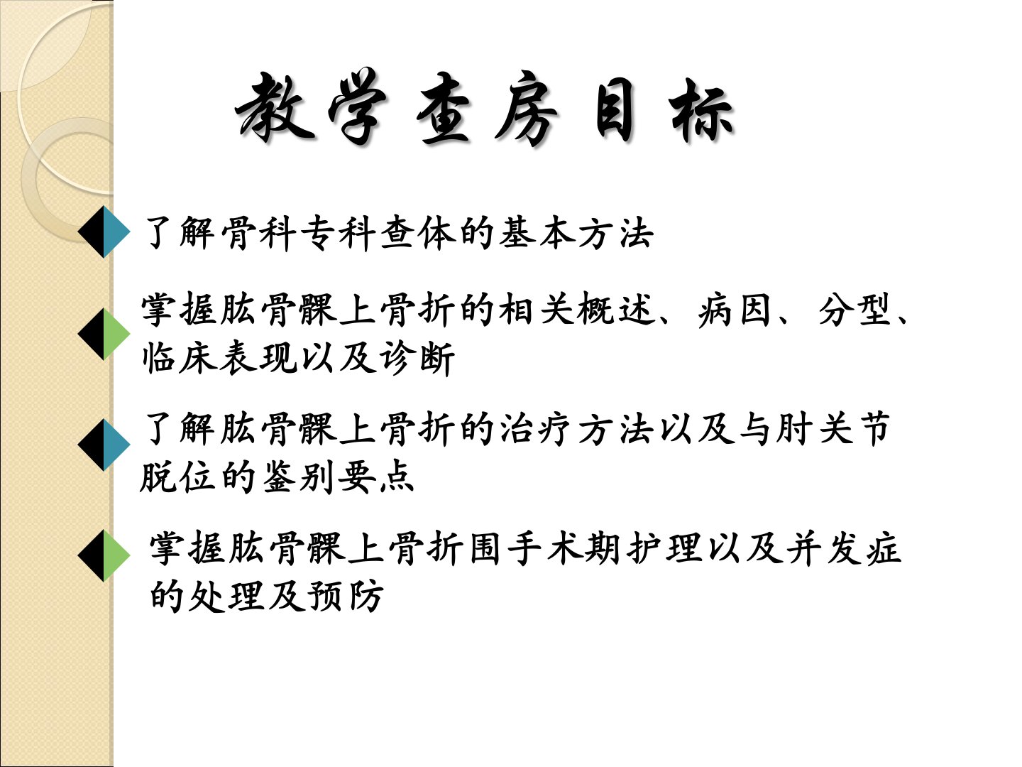 本次教学查房目标为掌握肱骨髁上骨折相关概述、病因、分型、临床表现、诊断、治疗方法及与肘关节脱位的鉴别要点了解围手术期护理及并发症处理。肱骨髁上骨折以小儿多见占儿童肘部骨折的3040好发于512岁此处为松质骨与坚质骨交界呈鱼尾状且肱骨下端前倾故易折断。病因多为间接暴力分伸直型(占90以上)、屈曲型和粉碎型。临床表现包括肘部肿胀、剧痛、活动受限等。诊断依据外伤史、症状及X线片需检查神经、血管损伤及5P征。治疗包括石膏固定、手法复位超关节小夹板固定及手术。术后护理包括监测生命体征、伤口护理、病情观察、疼痛护理、患肢护理、功能锻炼及饮食护理。并发症有Volkmann缺血性肌挛缩、肘内翻、神经损伤、肘外翻及关节活动障碍。出院后需定期门诊复查坚持功能锻炼避免剧烈活动。
