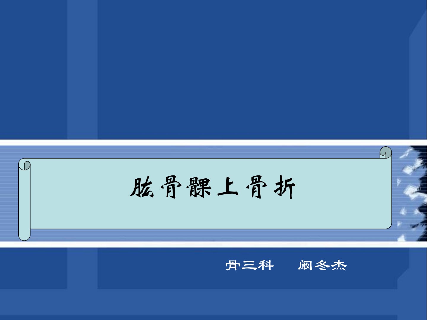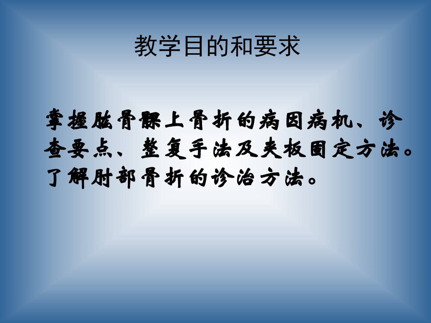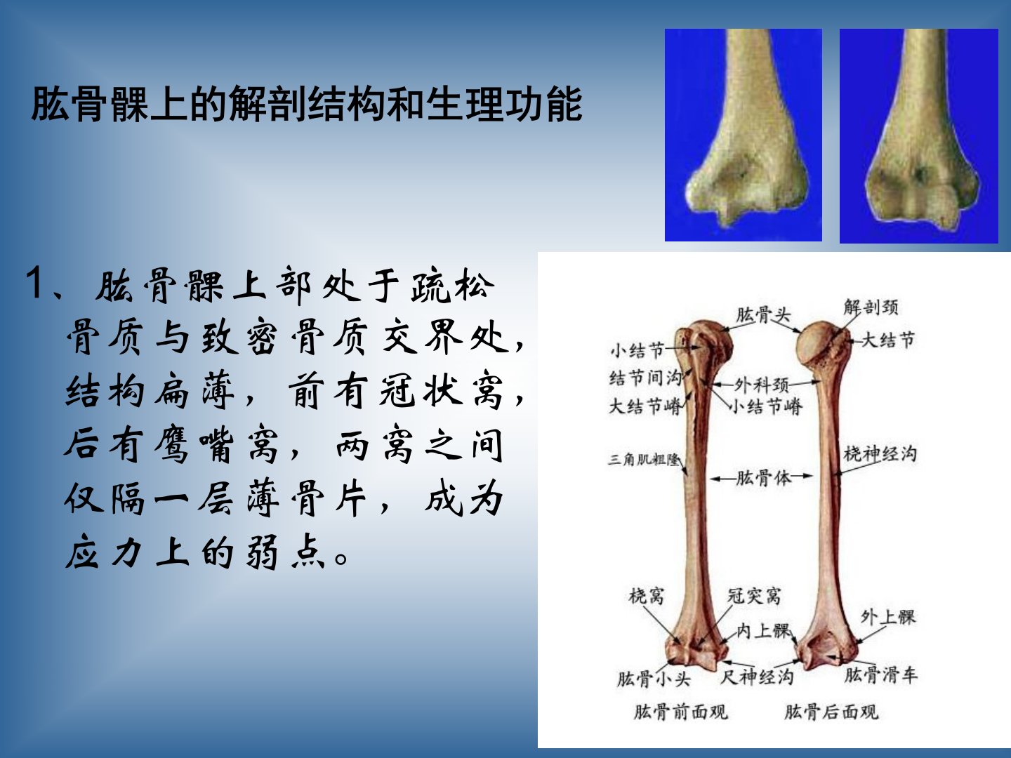 肱骨髁上骨折教学摘要教学目的和要求掌握肱骨髁上骨折的病因病机、诊查要点、整复手法及夹板固定方法了解肘部骨折诊治方法。解剖结构与生理功能肱骨髁上部结构扁薄是应力弱点。肱骨下端参与肘关节构造有两个生理角度骨折移位可致肘内翻或外翻畸形。其周围有重要血管神经通过骨折时易合并损伤。定义与病因肱骨髁上骨折以肘部疼痛肿胀等为主要表现发生在肱骨下端特定位置。多发生于10岁以下儿童多因跌倒所致多属间接暴力分伸直型、屈曲型和粉碎型三种伸直型最常见。诊查要点有明显外伤史X线可辅助诊断。并发症包括Volkmann缺血性肌挛缩、肘内外翻、神经损伤、肘关节骨化性肌炎等。治疗手法整复夹板外固定是常用方法保守治疗无效或出现特殊情况时可行手术治疗如闭合复位经皮克氏针内固定、切开复位内固定。