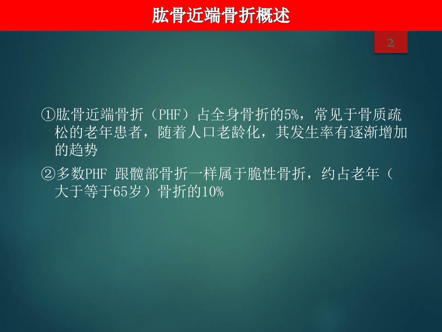 肱骨近端骨折分型及治疗摘要阳春市中医院创伤二科伍志明介绍了肱骨近端骨折(PHF)相关知识。PHF占全身骨折的5常见于骨质疏松老年患者且随老龄化发生率增加多数属脆性骨折约占老年(65岁)骨折的10。肱骨近端血供由腋动脉发出的旋肱前、后动脉供应。分型上Neer于1970年提出四部分分类法依肱骨上端4个组成部分相互移位程度分6个基本类型移位1cm或成角45才算移位骨块另有AO分型。诊疗方案包括保守治疗适用于难成功的二、三、四部分骨折;内固定手术(微创内固定、钢板、髓内钉系统等);人工关节置换(半肩或反肩置换)。手术入路多样各有特点与注意事项。还分享了45岁患者右肱骨近端骨折(NeerII2部分骨折)的典型病例分析了术前准备、术中处理、局部解剖不熟悉等问题及原因提出术后检查、固定、锻炼等建议强调重点加强肌肉等长收缩锻炼同时分享了处理并发症等相关经验。