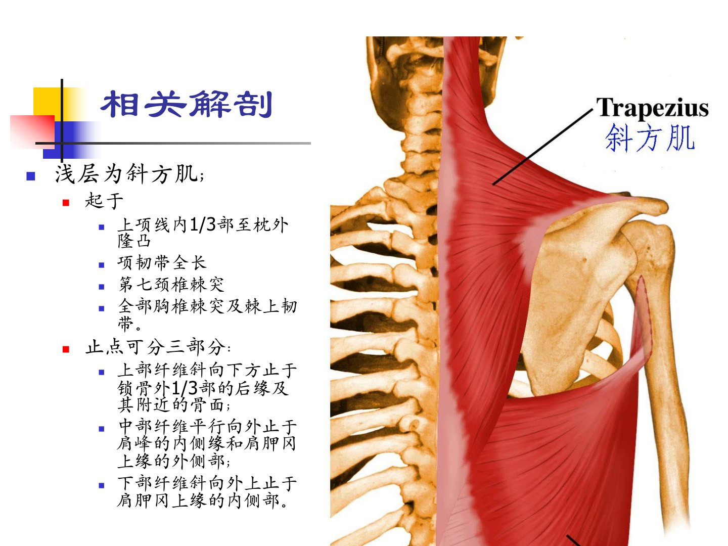 浅层为斜方肌;起于上项线内1/3部至枕外隆凸项韧带全长第七颈椎棘突全部胸椎棘突及棘上韧带。止点可分三部分:上部纤维斜向下方止于锁骨外1/3部的后缘及其附近的骨面;中部纤维平行向外止于肩峰的内侧缘和肩胛冈上缘的外侧部;下部纤维斜向外上止于肩胛冈上缘的内侧部。斜方肌上部肌束收缩,使肩胛骨上提、上回旋、后缩靠近脊柱。中部肌束收缩使肩胛骨后缩。下部肌束收缩使肩胛骨下降、上回旋。如一侧肌束收缩使头向同侧屈和对侧旋转;两侧同时收缩使头后仰和脊柱伸直。中层为夹肌头夹肌起自项韧带的下部(约第三颈椎以下)以及第三胸椎棘突止于上项线的外侧部分,部分肌束止于乳突的后缘颈夹肌起自第3到第6胸椎棘突止于第2到第3颈椎横...