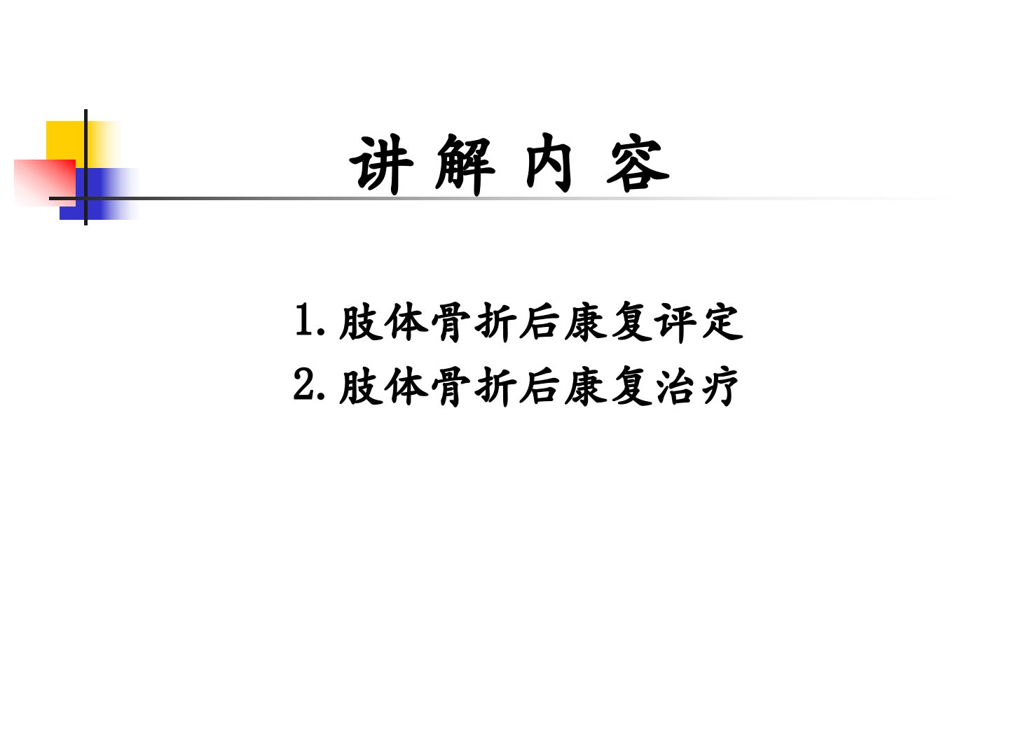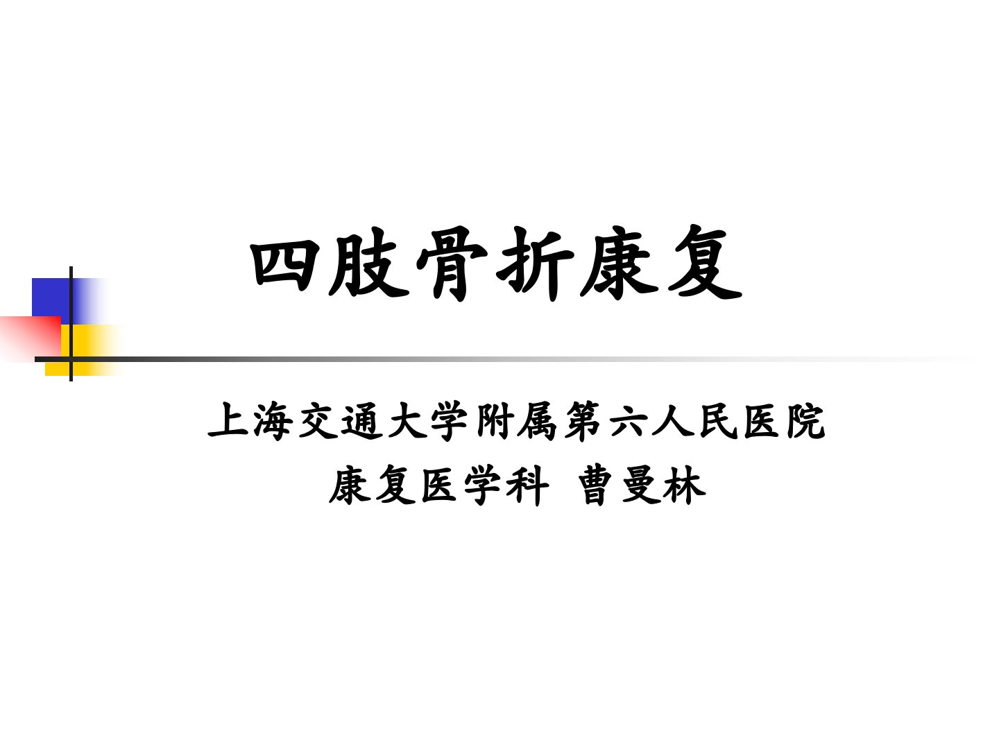 上海交通大学附属第六人民医院康复医学科曹曼林医生讲解了四肢骨折康复评定与治疗。康复评定包括:1一般情况:心肺功能、肢体外观、伤口情况等。2肢体长度及周径:了解肢体有无短缩、肿胀、肌肉萎缩采用两侧对比测量法。3关节活动度:了解关节活动度损伤程度测量时需注意姿势、量角器固定等。4肌力评定:了解肌肉力量及活动情况评价治疗效果方法包括徒手、简单器械、等速肌力测试。5感觉功能评定:判断周围神经损伤情况。6日常生活能力评定:针对上肢、下肢功能进行评定。康复治疗分早期和后期。早期以固定治疗为主目的在于促进功能恢复预防后遗症;治疗包括物理、心理、器械、运动、手法治疗等。后期针对关节僵硬等问题目的在于改善关节活动度、增加肌肉力量、恢复功能;治疗包括物理、作业、心理、器械、运动、手法治疗等。恢复期康复需注意训练量、禁忌暴力等。