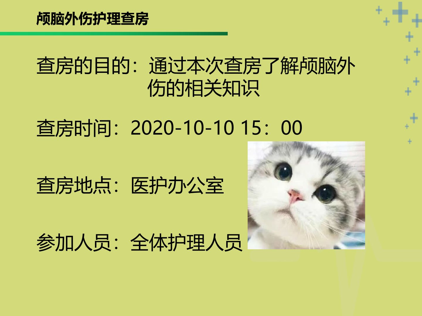 2020年10月10日1500内三科进行颅脑损伤病人的护理查房全体护理人员参加。查房目的为深入了解颅脑外伤相关知识。患者刘传翠73岁女性因外伤致意识不清于2020年10月4日紧急接受了“血肿清除术去颅瓣减压术”术后转ICU监护。现患者昏迷依赖呼吸机辅助呼吸且多项生命体征数据均有异常还有多年糖尿病史。中医诊断为头痛血瘀气滞西医诊断包括左额颞顶部硬膜下血肿、脑疝等。颅脑损伤按病情分为轻、中、重、极重四型常见于意外交通事故等情况。护理上针对颅内感染风险需妥善固定引流管保持引流通畅定期换药。针对体温过高要遵医嘱给予物理降温加强病情观察。针对皮肤受损风险要置气垫床加强翻身拍背。同时需关注营养失调问题做好基础护理和健康教育包括心理、饮食指导及康复期护理。最后各护理人员还汇报了VTE高风险的预防、非计划性拔管高风险预防等护理要点。