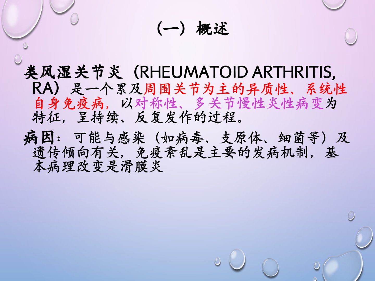 类风湿关节炎(RA)是累及周围关节的异质性、系统性自身免疫病以对称性、多关节慢性炎性病变为特征病因与感染、遗传倾向有关免疫紊乱是主要发病机制基本病理改变为滑膜炎。其临床表现包括关节表现(晨僵、关节痛、肿、畸形及功能障碍)、关节外表现(类风湿结节、血管炎、肺间质病变等)及心理状态异常(情绪低落、焦虑等)。辅助检查包括血液检查(贫血、血沉增快等)、自身抗体检测(类风湿因子、抗CCP抗体等)及影像学检查(关节X线片)。治疗目标是减轻症状、延缓病情、保护关节功能方法包括一般治疗、药物治疗(非甾体抗炎药、改变病情抗风湿药、糖皮质激素、植物药)及外科手术治疗。护理重点为提高患者生活自理能力包括一般护理、关节护理、用药护理及病情观察。健康教育强调尽早正规治疗、休息与锻炼结合、避免诱发因素。