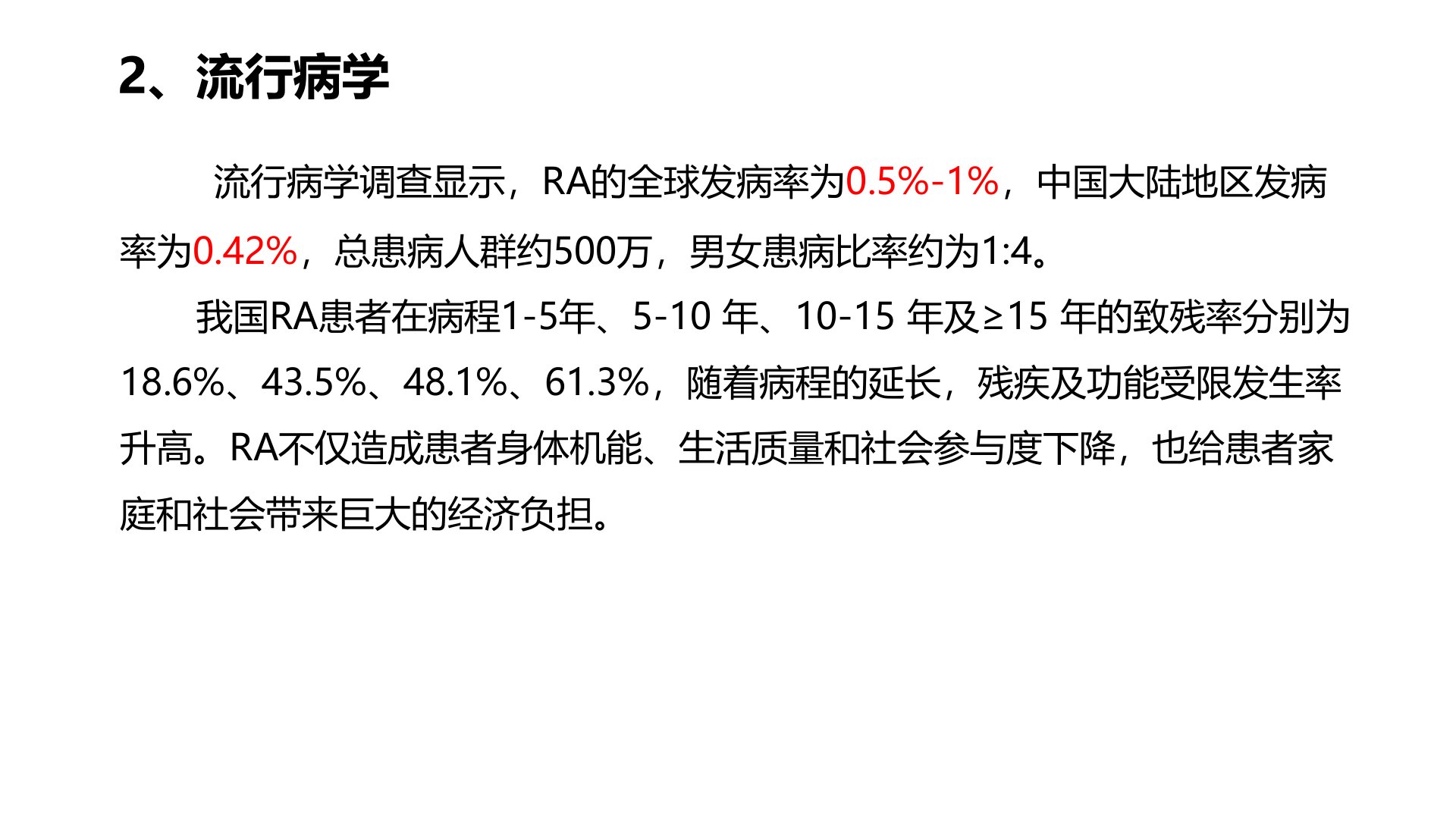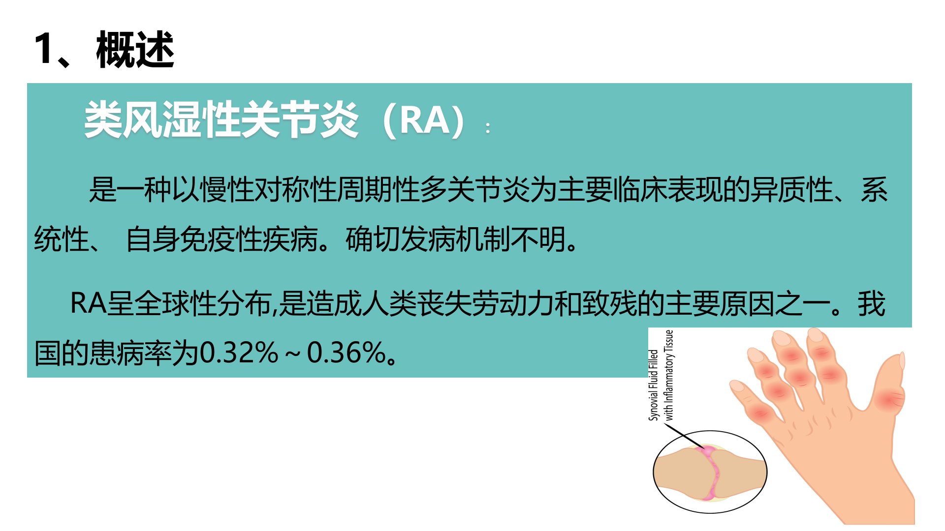 类风湿性关节炎(RA)是异质性、系统性自身免疫性疾病以慢性对称性周期性多关节炎为主要表现确切发病机制不明呈全球性分布是致残和丧失劳动力的主要原因之一我国患病率为032036。流行病学显示RA全球发病率05中国大陆042总患病人群约500万男女患病比率约14。RA致残率随病程延长而升高给患者家庭和社会带来沉重经济负担。感染、遗传、免疫紊乱是RA主要发病机制滑膜炎是基本病理改变类风湿结节和血管炎是重要病变。临床表现有关节和关节外表现诊断要点采用1987年ACR修订标准或2010年ACREULAR分类标准。案例中患者沈兰73岁女性反复多关节疼痛12年确诊RA且伴高血压经锝99亚甲基二磷酸盐改善骨代谢、尼莫地平控制血压等治疗疼痛好转未发生失用综合征自理能力评分100分住院期间心情良好。健康指导包括合理饮食、避免诱发因素、遵医嘱服药、功能锻炼和定期检测等。