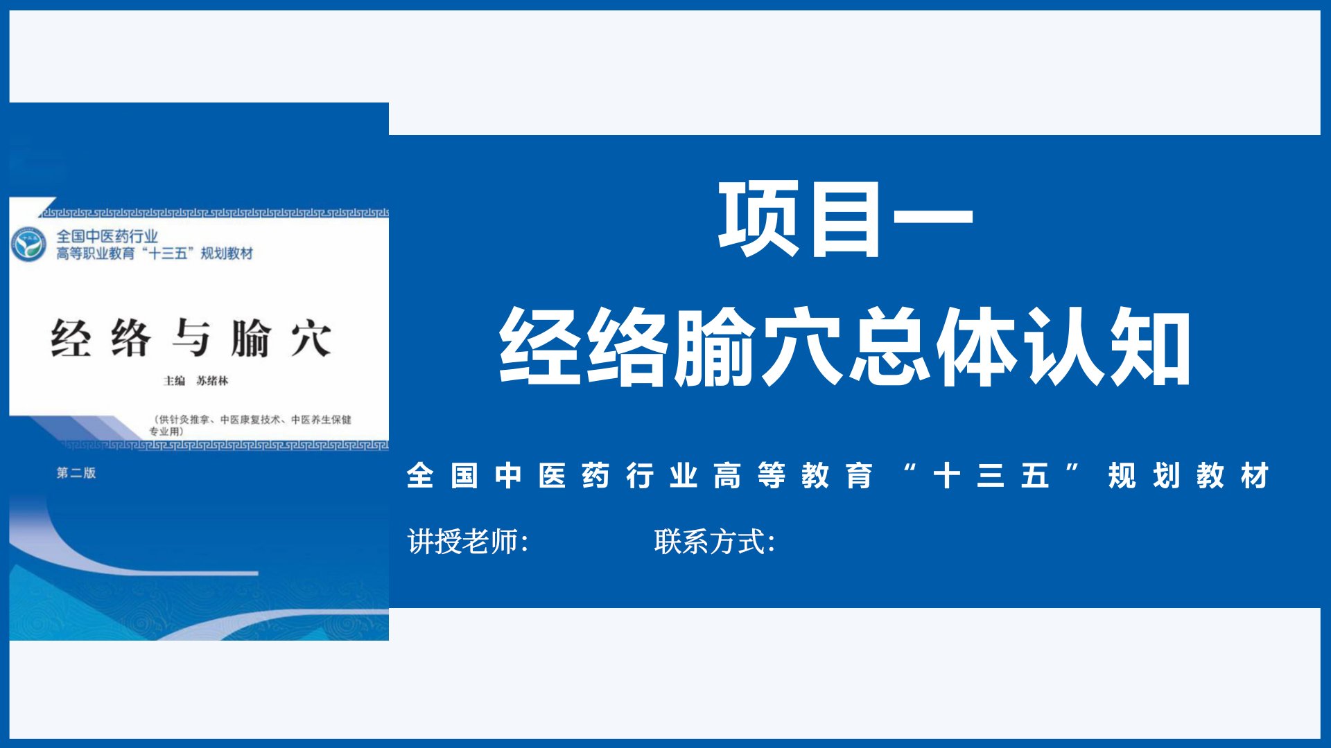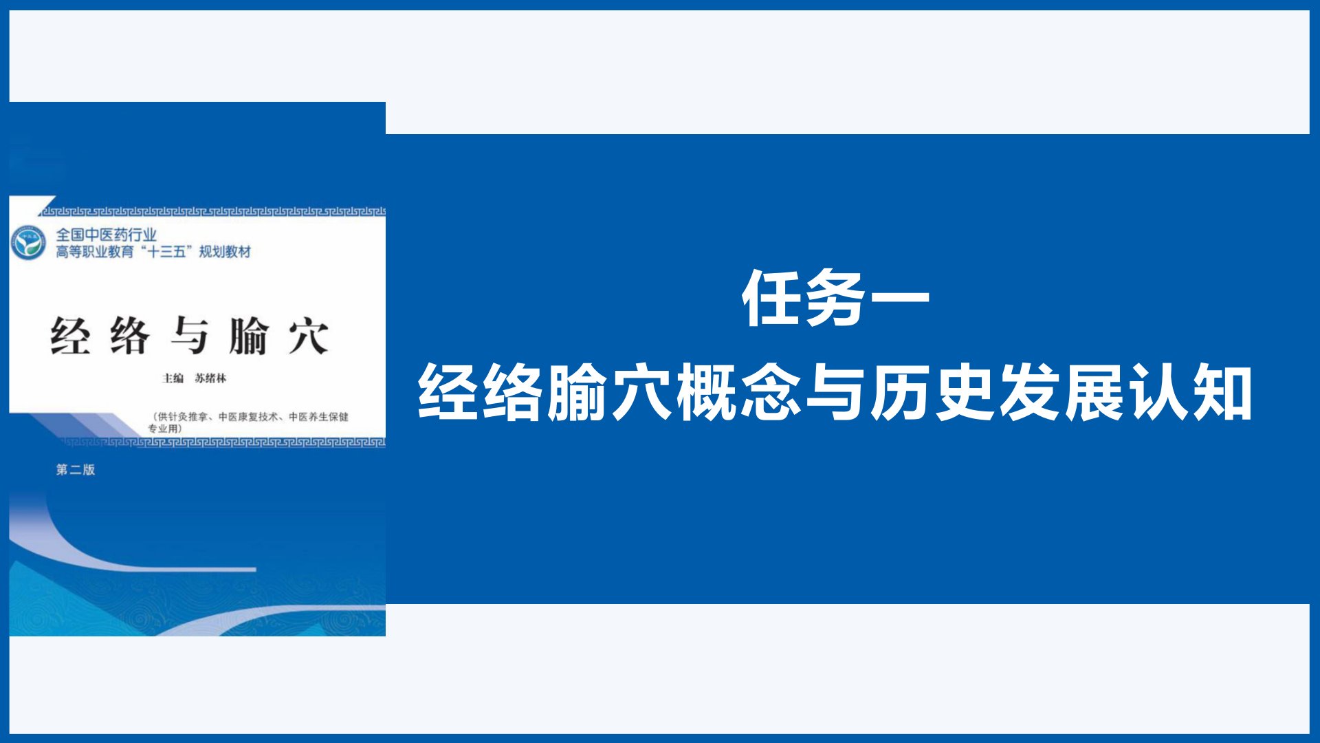 项目一经络腧穴总体认知任务一经络腧穴概念与历史发展认知【学习目标】掌握经络和腧穴的概念。熟悉各时期经络腧穴著作的作者及内容特点。了解经络和腧穴的发展历史。经络的概念经络,是经脉和络脉的总称,是人体内运行气血的通道。经,有路径的含义,经脉贯通上下、沟通内外,是经络系统中的主干;络,有网络的含义,络脉是经脉别出的分支。经络纵横交错,遍布全身,以运行气血、濡养周身。经络学说,是阐述人体经络系统的循行分布、生理功能、病理变化及其与脏腑相互关系的理论。经络理论的形成与发展在对“脉”和“气血”不断认识的基础上,古代医家结合导引行气、针灸感传现象、体表病理现象、腧穴主治规律以及解剖观察等,相互启发,相互佐证...
