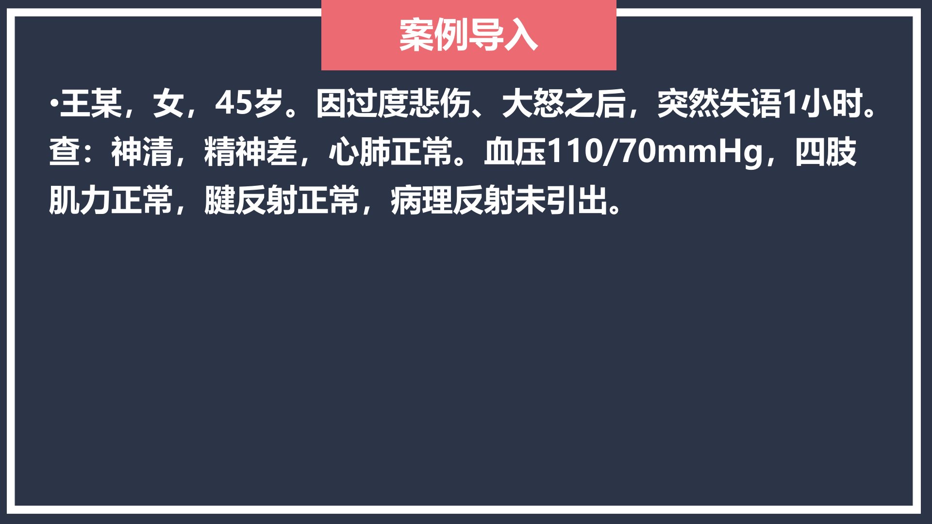 王某45岁女性因过度悲伤、大怒后突发失语1小时就诊查体无异常。郁病以心情抑郁、情绪不宁等为主要表现多见于女性涵盖西医学的抑郁症、焦虑症等疾病。其病因与情志不畅、饮食不节等有关基本病机是气机郁滞脏腑阴阳气血失调病位在脑与心、肝等脏器密切相关。辨证要点分肝气郁结、气郁化火、忧郁伤神、心脾两虚、阴虚火旺等证型各有其主症及舌脉表现。治疗以疏肝解郁、调畅气机为主主穴取神门、内关、膻中、太冲、百会等配穴依证型加减。其他治疗包括耳针法、穴位注射法、电针法、穴位埋线法等。针灸治疗郁病效果较好但需配合心理治疗并排除器质性疾病注意与其他精神症状疾病鉴别同时强调精神调摄、适度锻炼及保持乐观情绪的重要性。