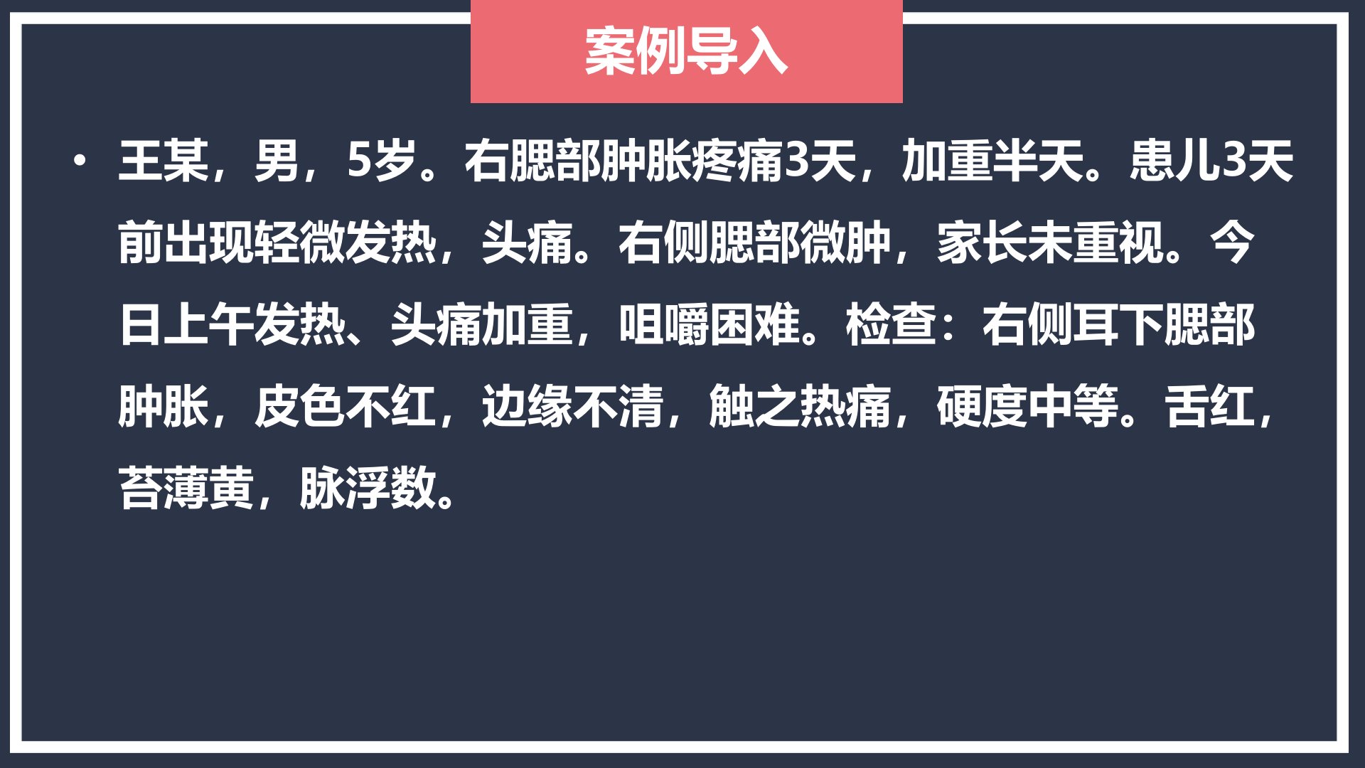 王某男5岁右腮部肿胀疼痛3天且加重半天3天前轻微发热头痛右侧腮部微肿未受重视今日上午症状加重检查见右侧耳下腮部肿胀皮色不红触之热痛此为痄腮案例。痄腮是以发热、耳下腮部肿胀疼痛为特征的急性传染病相当于西医学的流行性腮腺炎冬春易流行多见于59岁小儿可并发睾丸炎由腮腺炎病毒引起通过飞沫传播应接种疫苗预防。其发生与感受风热疫毒之邪有关基本病机为温毒之邪蕴结于少阳、阳明经病位在腮腺及少阳经络。辨证要点分温毒郁表、温毒蕴结、温毒内陷。治疗上基本治疗以清热解毒、消肿散结为主取手少阳、手阳明经穴;其他治疗包括耳针法、灯火灸法。本病属急性呼吸道传染病应注意隔离患儿发热期间应卧床休息进食流质或半流质饮食。