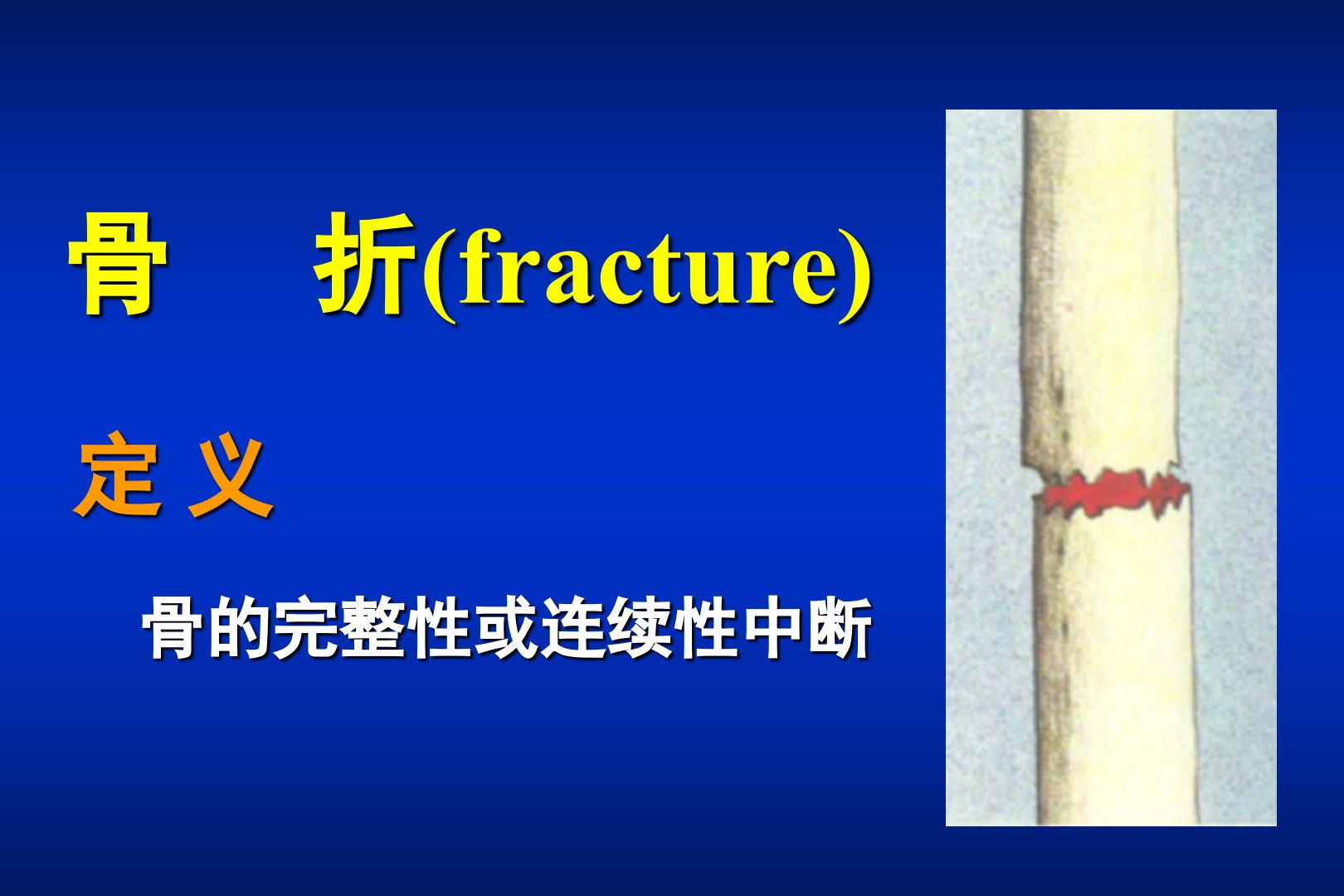 骨折概论定义骨的完整性或连续性中断骨折(fracture)一、病因外伤性和病理性直接暴力:暴力直接作用间接暴力:暴力通过传导、杠杠、旋转和肌收缩使肢体远处发生骨折积累性劳损:长期、反复、轻微的直接或间接伤力集中在骨骼的某一点外伤性骨折直接暴力间接暴力肌肉拉力直接暴力间接暴力病理性骨折有疾病的骨骼(如骨髓炎、骨肿瘤等),遭受轻微外力即断裂二分类(一)骨折处皮肤、粘膜的完整性闭合性骨折端不与外界相通开放性由外向内由内向外(二)骨折程度和形态不全骨折骨的连续性部分中断移位及畸形不明显裂缝骨折青枝骨折(多见儿童)完全骨折连续性完全中断横行骨折斜形骨折螺旋形骨折粉碎性骨折嵌插骨折(多见于干骺端骨折)压缩...
