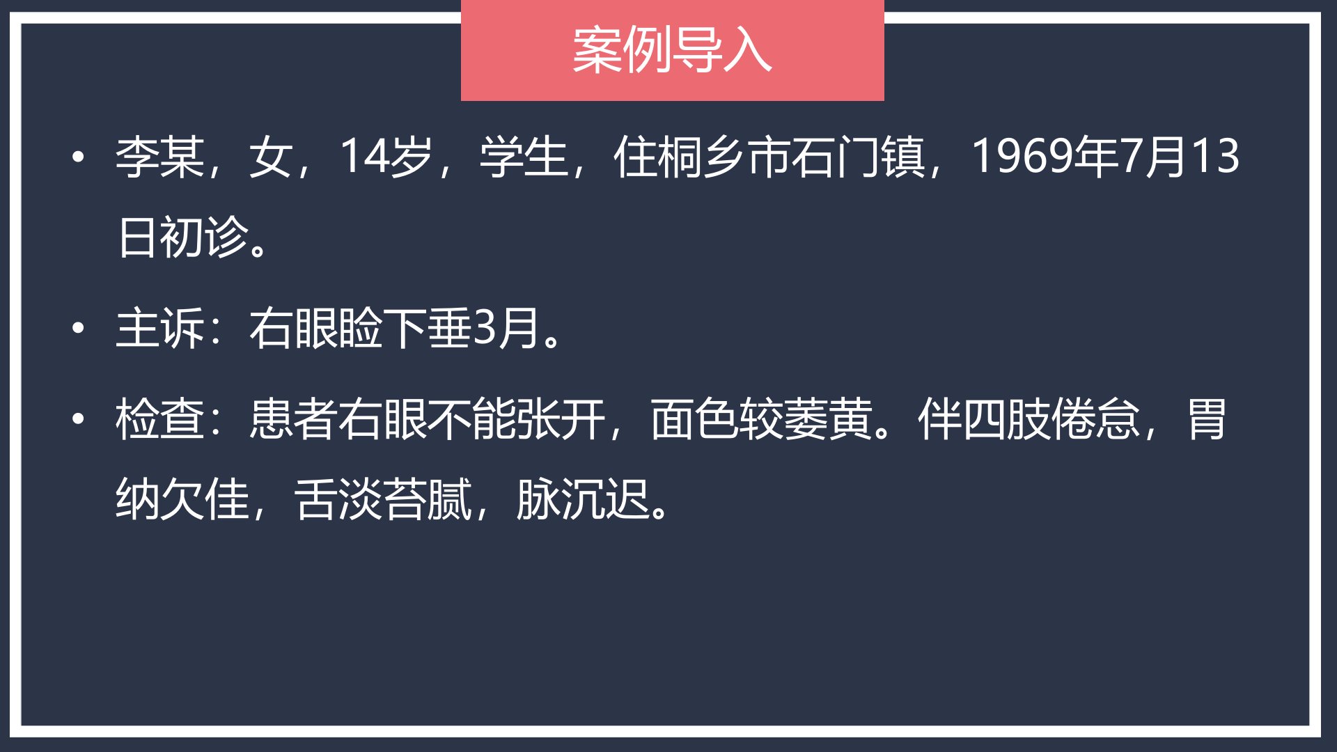 14岁女性患者李某主诉右眼睑下垂3月伴面色萎黄、四肢倦怠、胃纳欠佳等症状。眼睑下垂古称“上胞下垂”等多见于动眼神经麻痹、重症肌无力眼肌型等疾病。病因多与感受风邪、先天不足、体虚气弱、外伤等有关基本病机是气虚不能上提、血虚不能养筋病位在胞睑筋肉与脾脏、足太阳经筋关系密切。辨证要点包括风邪袭络、脾虚气弱、肝肾不足等症型。治疗以益气健脾、养血荣筋为主取眼周腧穴及背俞穴如丝竹空、攒竹、阳白、三阴交、脾俞、肾俞等配穴依症型而定。其他治疗包括耳针法、皮肤针法。针灸治疗有一定效果先天重症患者需考虑手术。可配合测量睑裂高度等以明确诊断。