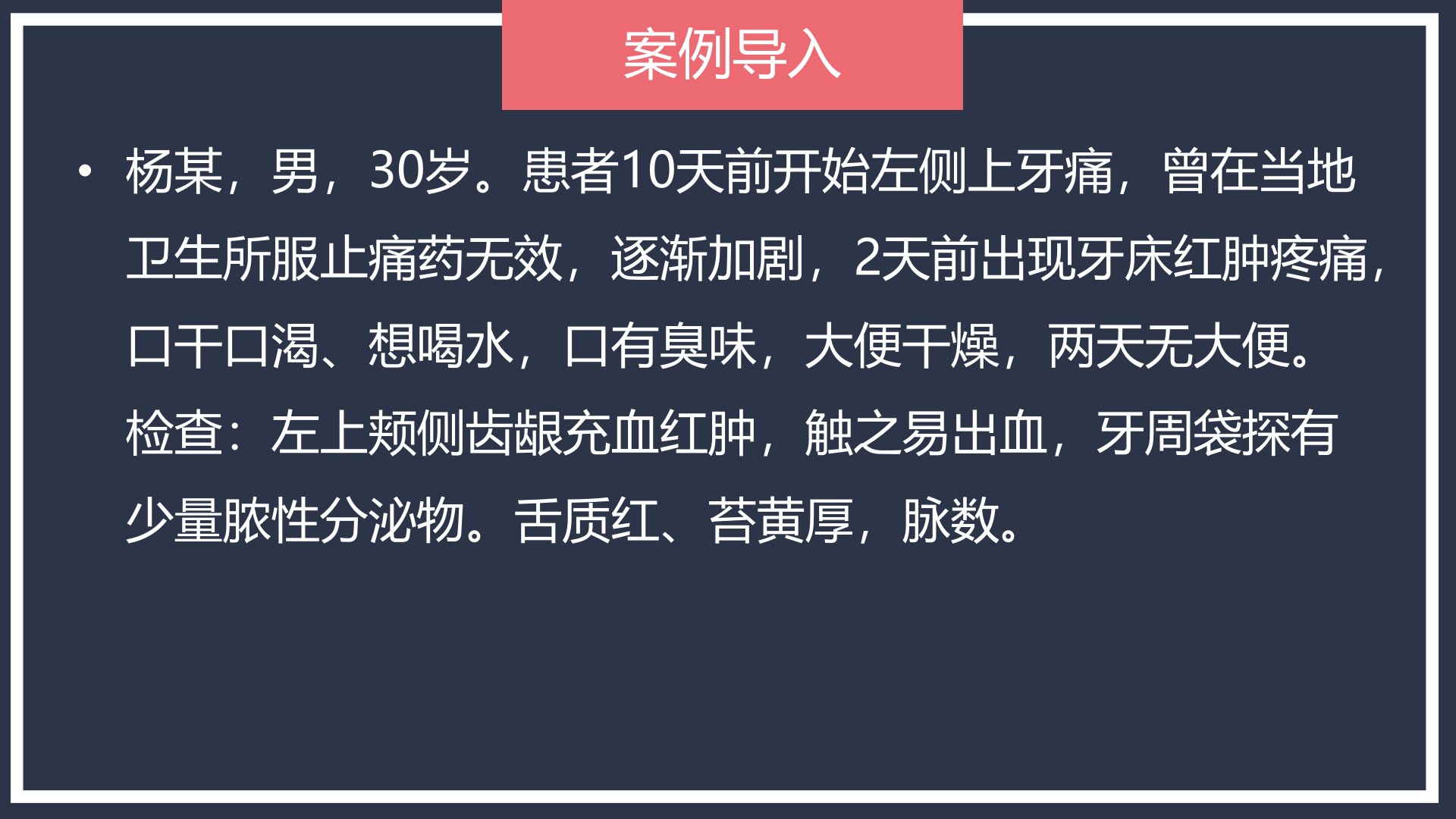 患者杨某30岁男性10天前左侧上牙痛服止痛药无效且加剧2天前牙床红肿、口干口臭、大便干燥。检查见左上颊侧齿龈充血红肿、触之易出血、牙周袋有少量脓性分泌物舌质红、苔黄厚、脉数。牙痛是以牙齿疼痛为主症的病证西医学中多见于龋齿、牙周炎等。牙痛多与外感风火邪毒、过食膏粱厚味、体弱过劳等因素有关基本病机是风火、胃火或虚火上炎病位在齿与胃、肾关系密切。治疗以祛风泻火、通络止痛为主取口周腧穴和手、足阳明经穴如下关、颊车、合谷等。风火牙痛配风池、外关胃火牙痛配二间、内庭虚火牙痛配太溪、行间。其他治疗包括耳针法、电针法、穴位注射法。针灸治疗牙痛疗效显著但只能暂时缓解龋齿等牙痛应明确诊断积极治疗原发病同时与三叉神经痛鉴别重视口腔卫生。