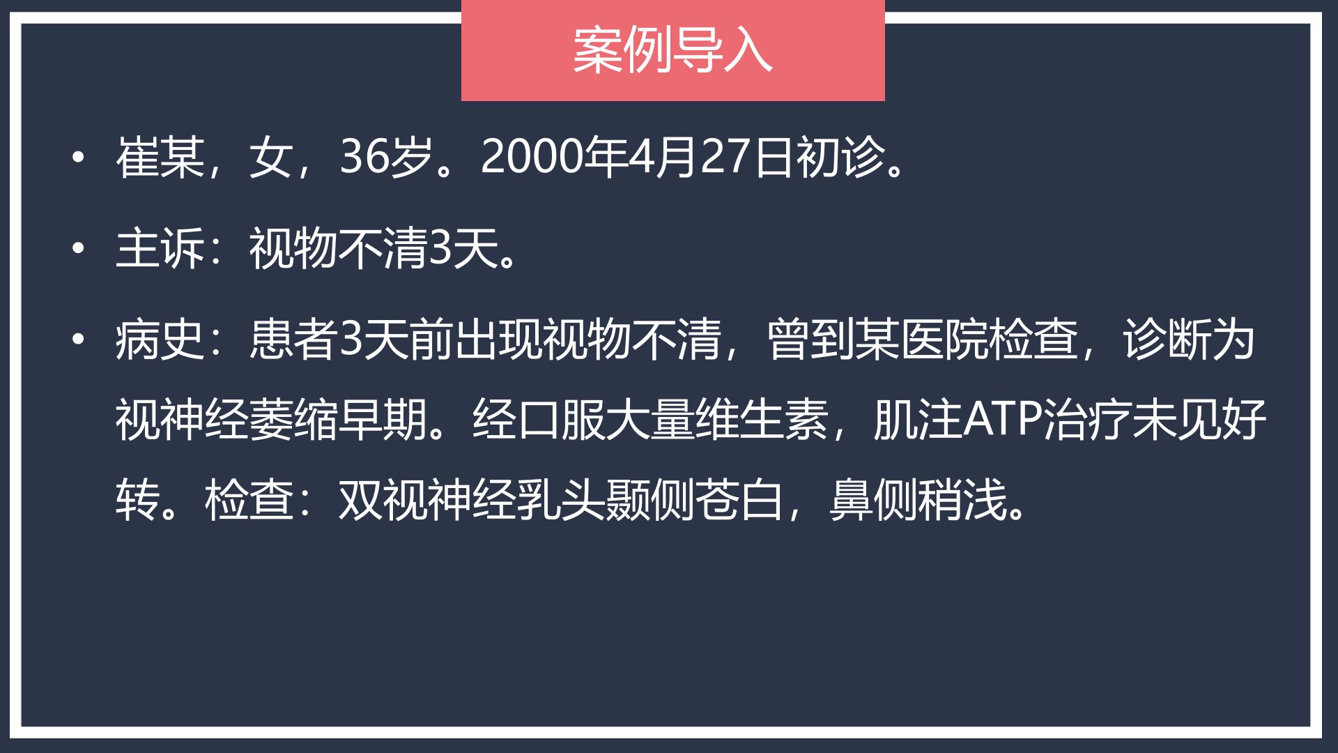 崔某女36岁2000年4月27日初诊因视物不清3天就诊检查诊断为视神经萎缩早期经口服维生素等治疗未见好转。视神经萎缩指视网膜神经节细胞轴索广泛损害导致的萎缩变性严重影响视力致盲率高。病因包括炎症、退变、缺血、外伤、遗传及占位性病变等无法自愈病因治疗为根本。中医认为其属“青盲”等范畴与心、肝、脾、肾关系密切病机为邪扰目窍或目窍失养。辨证要点包括肝气郁结、气血瘀滞、肝肾亏虚等。治疗以调补肝肾、养精明目为主取眼区局部穴及足少阳、足厥阴经穴如球后、睛明、承泣等并配以相应穴位。其他治疗包括耳针法、头针法、皮肤针法等。视神经萎缩是眼科难治性疾病针灸治疗有一定疗效可控制病情提高视力延缓致盲。