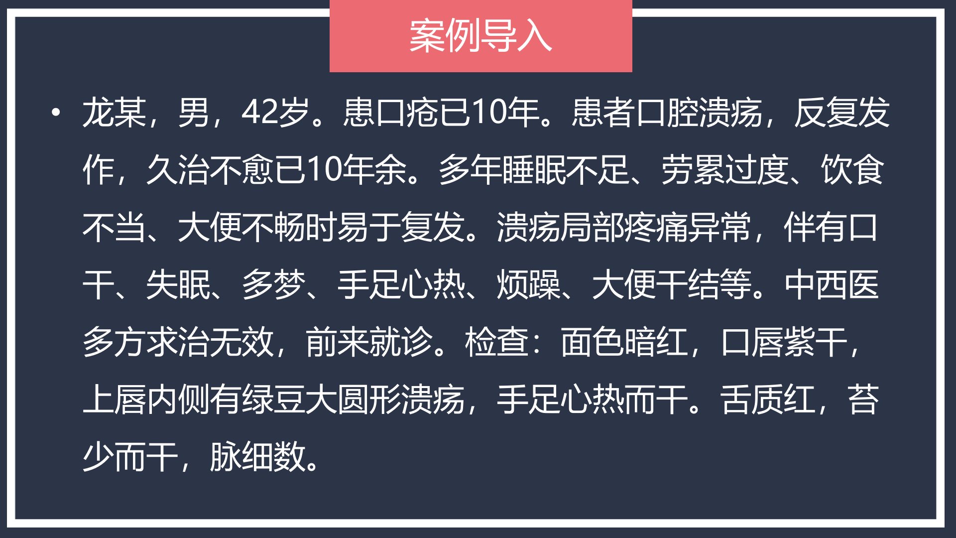 龙某42岁男性患口疮10年反复发作且久治不愈多因睡眠不足、劳累、饮食不当、大便不畅时复发症状包括溃疡疼痛、口干、失眠、多梦、手足心热、烦躁、大便干结等。检查见其面色暗红、口唇紫干、上唇内侧有溃疡、手足心热而干舌质红苔少而干脉细数。口疮以口腔黏膜溃疡为主症多见于复发性口炎等疾病主要症状为口腔黏膜充血、水肿等一般预后良好但部分患者可复发。口疮病因多与外感风火燥邪、过食辛辣、病后劳损或体弱有关基本病机为火热上炎于口舌与心、脾、肾关系密切。治疗以清热泻火、消肿止痛为主取口周腧穴和手足阳明经穴如承浆、地仓、廉泉、合谷等。配穴根据证型选择如心脾蕴热配内庭、劳宫阴虚火旺配照海、太溪。其他疗法包括耳针法、三棱针法、穴位贴敷等。针灸治疗口疮有一定效果尤以急性者为好。平时应注意口腔卫生少食辛辣等刺激性食物。