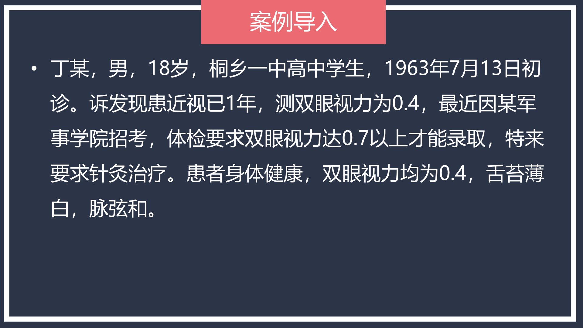18岁学生丁某近视一年双眼视力04因军事学院招考体检要求来诊希望以针灸治疗提升视力。近视以视近清晰、视远模糊为特征多属屈光不正受遗传、环境因素影响与心、肝、脾、肾关系密切。病因多与禀赋不足、劳心伤神、不良用眼习惯有关病机为目络瘀阻、目失所养。辨证要点包括视力减退、双目干涩等症状分肝肾不足、心脾两虚两型。治疗以通经活络、养肝明目为主取眼周腧穴及足少阳经穴如承泣、睛明、四白、太阳、风池、光明等配穴依证型选择。其他疗法包括耳针、皮肤针、头针法。按语指出针灸对轻中度近视效果较好假性近视效果显著且年龄越小治愈率越高同时强调用眼卫生和眼保健操的重要性。