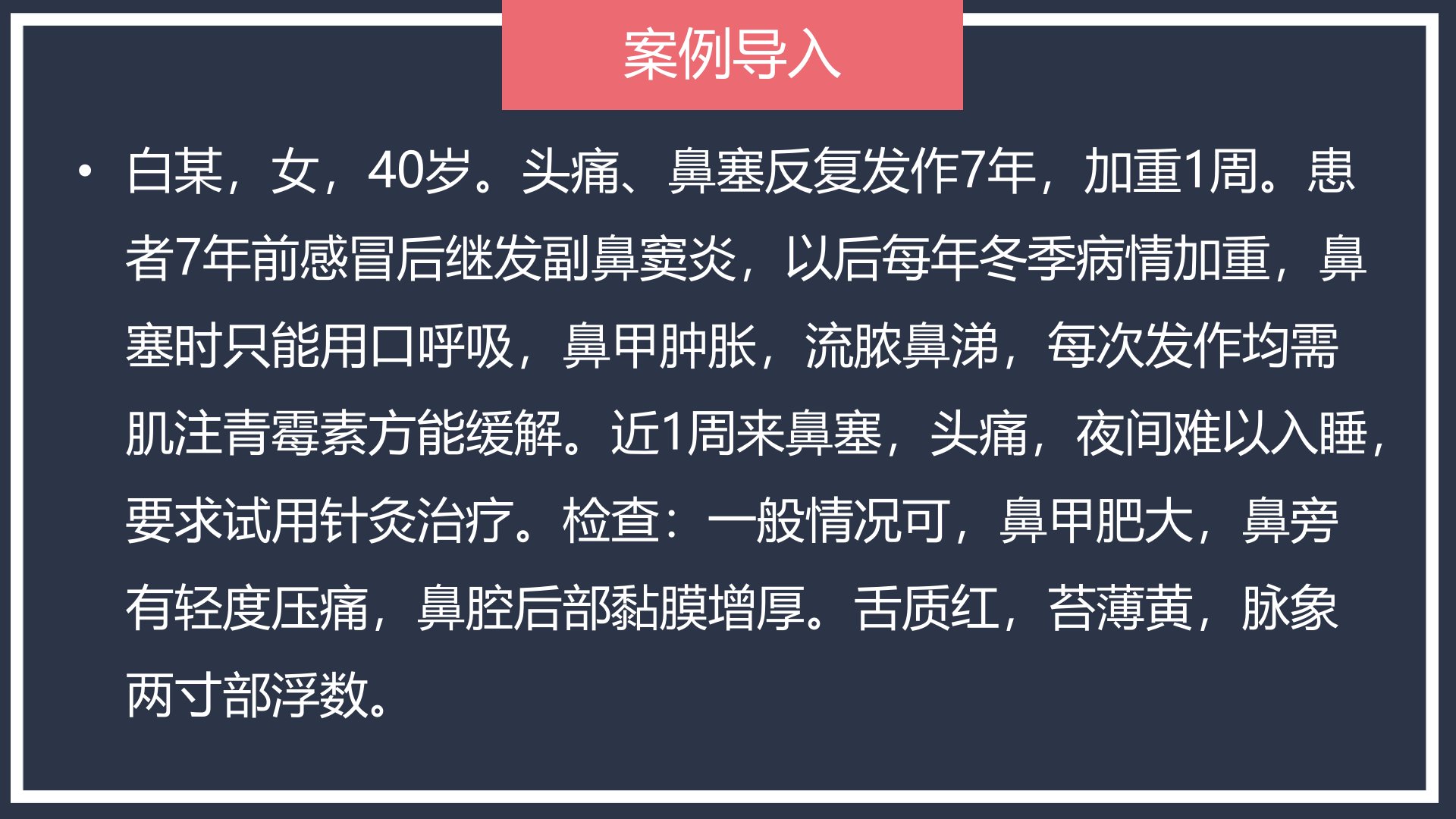 白某40岁女性反复头痛、鼻塞7年冬季加重近1周症状加剧夜不能寐故来求针灸治疗。检查示鼻甲肥大鼻旁压痛黏膜增厚舌红苔薄黄脉象两寸部浮数。鼻渊以鼻流浊涕、鼻塞等为主症多见于急慢性鼻炎、鼻窦炎等病因与外邪、胆腑郁热、脾胃湿热等有关基本病机是邪壅鼻窍与肺、脾、胃、胆关系密切。治疗以通利鼻窍为主取鼻周及手太阴、阳明经穴如迎香、上迎香、印堂等。肺经风热配尺泽、少商;胆经郁热配阳陵泉、侠溪;脾胃湿热配内庭、阴陵泉;肺脾气虚配肺俞、脾俞。其他疗法包括耳针、头针、穴位注射、艾灸等。按语指出针灸治疗鼻渊有一定效果慢性鼻炎反复发作者应排除肿瘤建议自我按摩加强锻炼预防感冒。知识链接引用了古代文献对鼻渊的论述及针灸治疗。