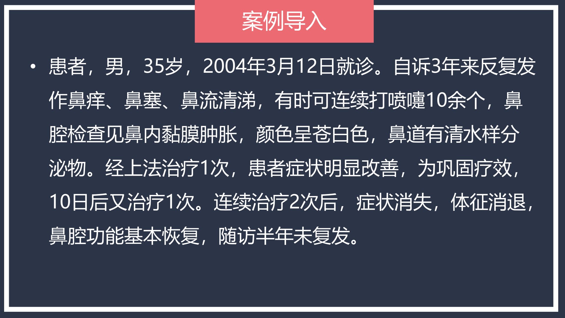 35岁男性鼻鼽患者2004年3月12日就诊自诉3年来反复鼻痒、鼻塞、流清涕、打喷嚏鼻腔检查见黏膜肿胀、苍白鼻道有清水样分泌物。经治疗1次后症状明显改善10日后又巩固治疗1次连续治疗2次后症状消失随访半年未复发。鼻鼽指突然和反复发作的鼻痒、打喷嚏、流清涕、鼻塞等特征的鼻病多见于变应性鼻炎、血管运动性鼻炎等。其发生与正气不足、外邪侵袭有关病位在鼻与肺、脾、肾三脏关系密切。治疗以调补正气、通利鼻窍为主取鼻部穴如上迎香、印堂等配穴依证型选择。其他治疗包括耳针法、穴位注射法、穴位贴敷法、皮肤针法等。针灸治疗鼻鼽有效尤其能迅速改善鼻道通气功能。患者应经常锻炼身体过敏性鼻炎患者还应积极查找过敏源避免接触。