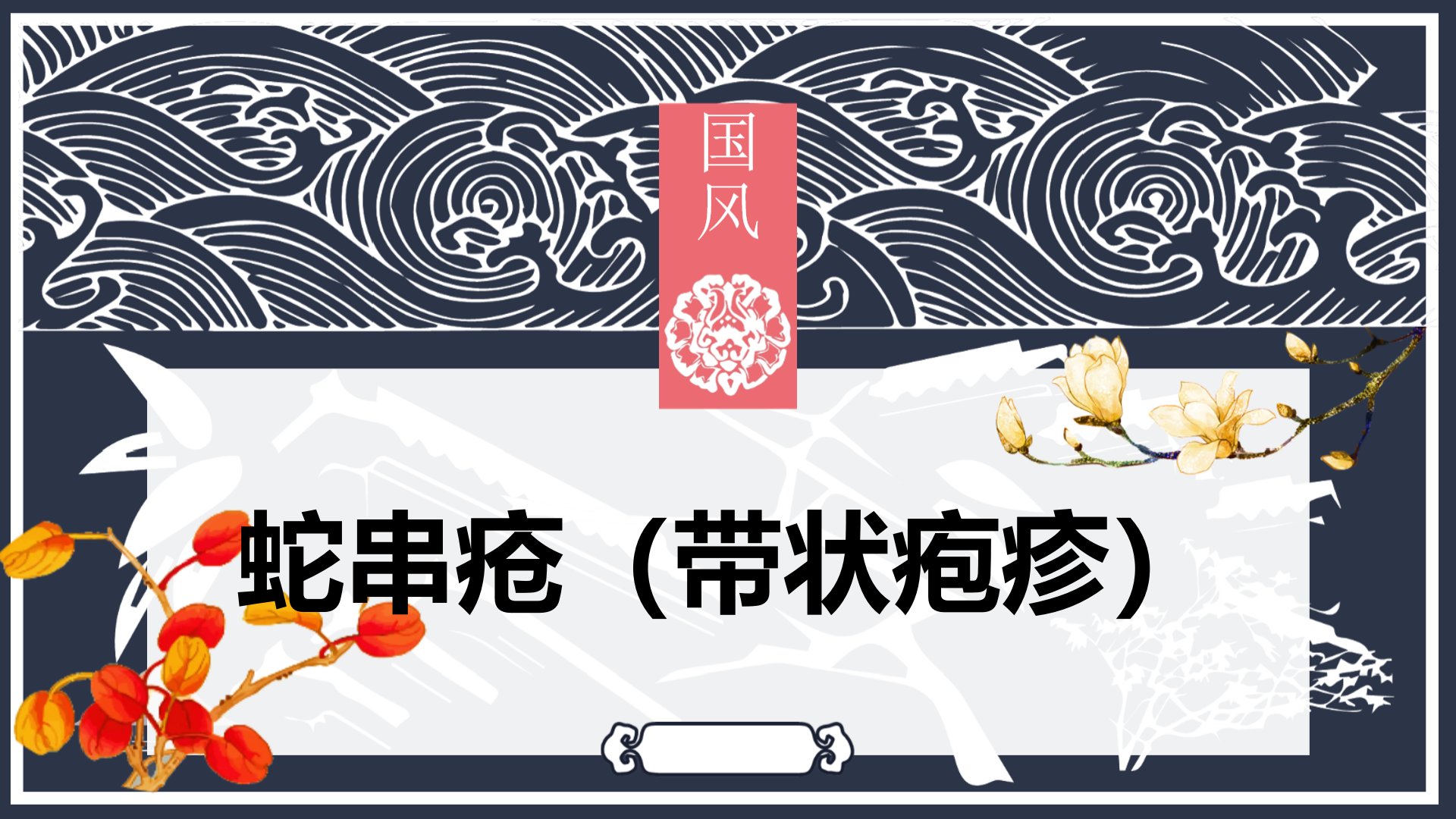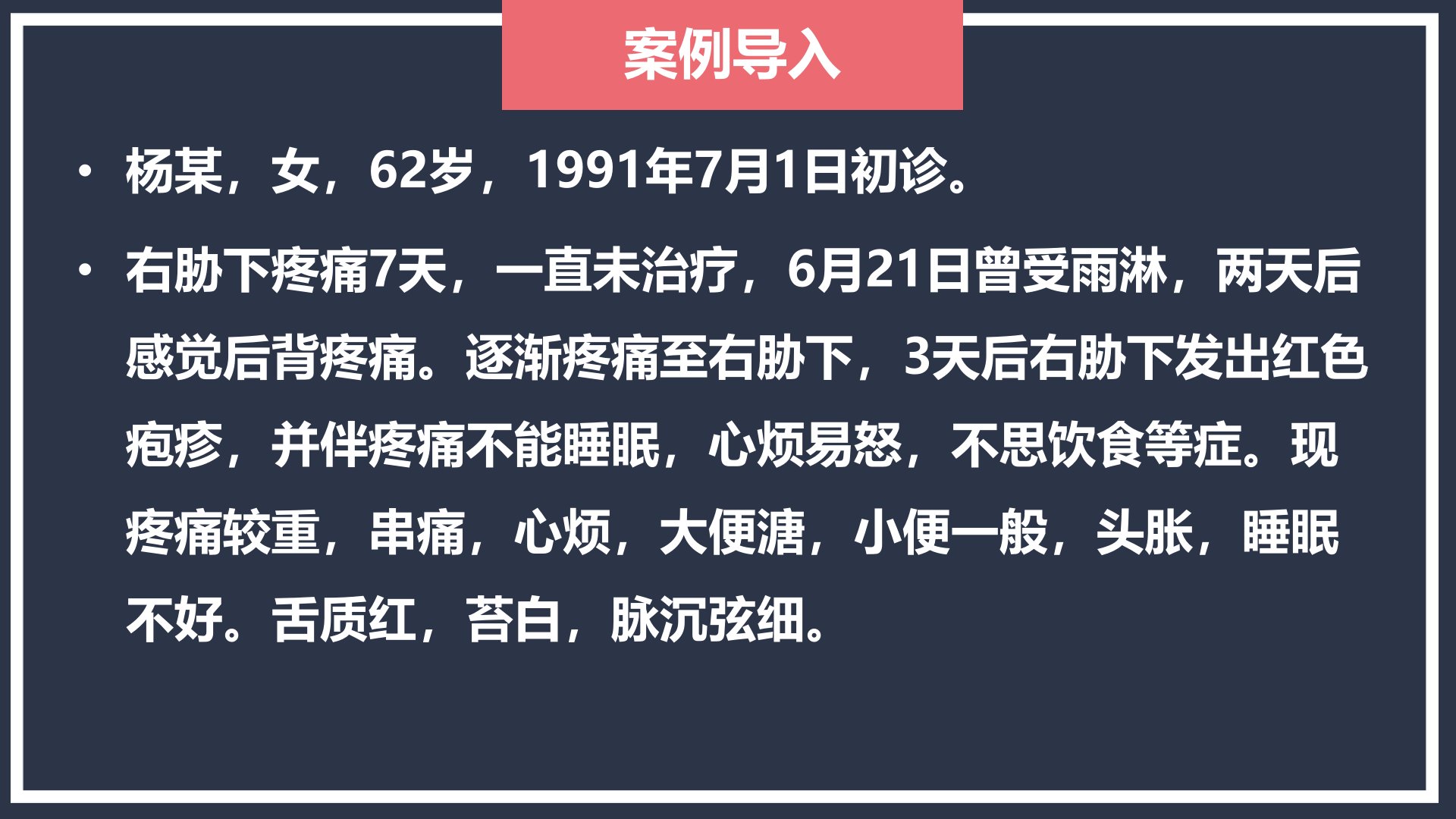 62岁女性杨某1991年7月1日初诊右胁下疼痛7天未治疗6月21日曾受雨淋后后背疼痛后发展至右胁下并发出红色疱疹伴疼痛、不能睡眠、心烦易怒、不思饮食等症状。蛇串疮(带状疱疹)是以皮肤突发簇集状疱疹呈带状分布并伴强烈痛感为主症的病证相当于西医学的带状疱疹由水痘带状疱疹病毒引起50岁以上人群易发可接种疫苗预防。其病因病机多与情志不畅、肝郁化火、过食辛辣厚味、湿热内盛、复感火热湿毒有关病位主要在肝、脾两经。辨证要点分肝经郁热、脾虚湿蕴、瘀血阻络三型。治疗以清热解毒利湿活血为主取阿是穴、相应夹脊穴及少阳、厥阴经穴为主毫针常规针刺阿是穴可围针、铺灸等。其他治疗包括灸法、梅花针法、火针法。针灸早期治疗效果显著可控制病灶扩散降低后遗神经痛出现率。治疗期间需忌食辛辣等发物。