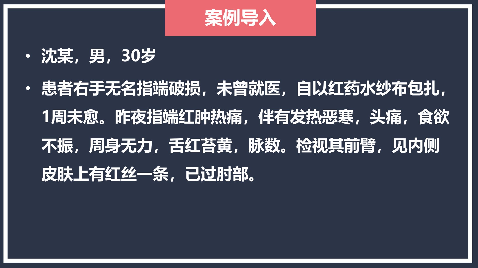 沈某30岁右手无名指端破损未就医1周未愈出现红肿热痛、发热恶寒等症状前臂内侧见红丝一条。疔疮好发于颜面部和四肢形小根深、坚硬如钉相当于西医学的疖、痈、急性甲沟炎等。其发生多与饮食不节、肌肤不洁、火毒侵袭有关基本病机是火毒蕴结肌肤、经络气血壅滞。辨证要点包括初起症状、热毒凝结、火毒炽盛、热盛肉腐、火毒流窜经络及疔疮走黄等证型。治疗以泻火解毒为主取督脉穴身柱、灵台为主穴配以合谷、委中等采用毫针刺泻法或三棱针点刺出血。其他治疗包括灸法、三棱针法、刺血拔罐法。针灸治疗疔疮有一定疗效但初起时切忌挤压和针刺患部以免感染扩散疔疮走黄证候凶险须及时抢救易患人群应忌食辛辣、鱼腥发物戒烟酒。