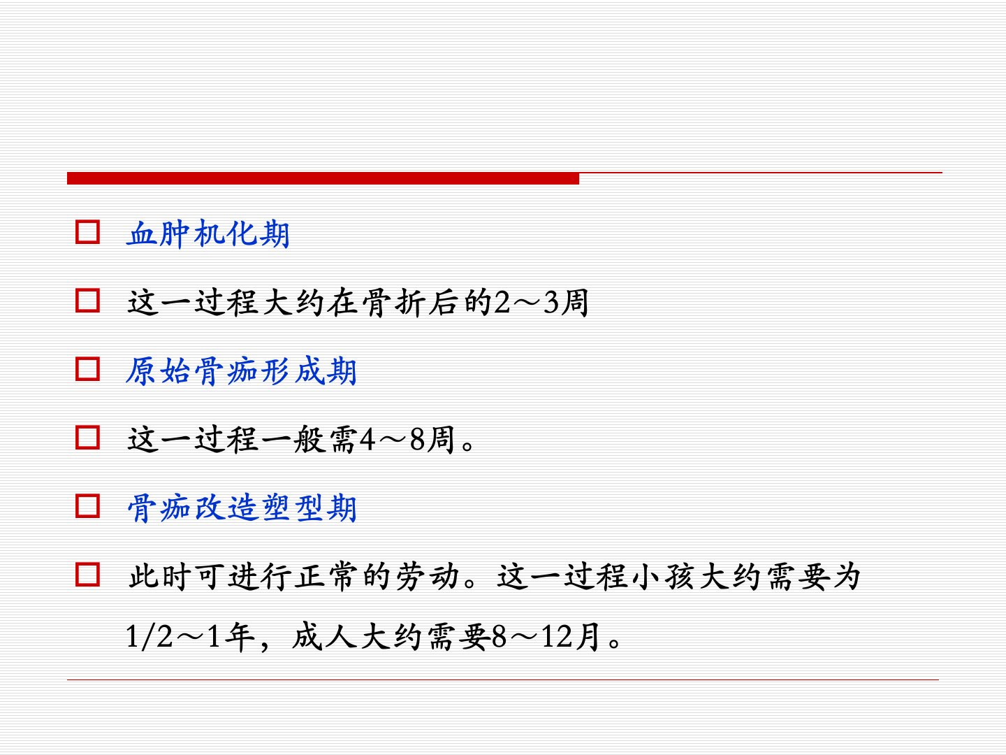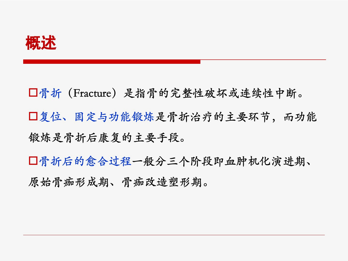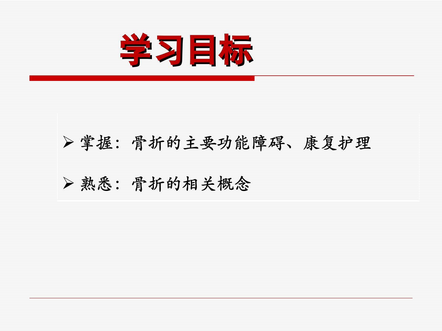 作为医生需掌握以下骨折相关知识:骨折是指骨的完整性或连续性中断治疗包括复位、固定和功能锻炼愈合分血肿机化演进期(23周)、原始骨痂形成期(48周)、骨痂改造塑形期(小孩12年成人812月)三个阶段。常见骨折平均愈合时间不一如掌骨骨折2周股骨颈骨折12周。主要功能障碍包括关节活动受限、肌力和耐力减退、肢体血液循环障碍、运动功能受损等还可能引发坠积性肺炎、便秘等并发症及心理问题。康复需评定骨折愈合、关节活动度、肌力等情况。康复护理包括病情观察、饮食指导(早期清淡中期高蛋白后期高热量)、阶段性康复锻炼(早期促进血液循环中期扩大活动范围后期抗阻训练)、治疗相关性护理(石膏固定、牵引、手术切开固定等注意事项)及心理护理和健康教育。