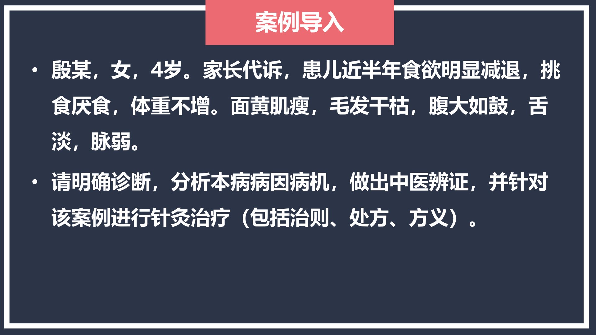 4岁女童殷某近半年食欲减退、挑食厌食、体重不增面黄肌瘦、毛发干枯、腹大如鼓被诊断为疳证。疳证是慢性疾病特征为面黄肌瘦、毛发稀疏枯黄、饮食异常等多见于小儿营养不良及部分寄生虫病。其病因包括喂养不当、病后失调、禀赋不足、感染虫疾等基本病机为脾胃受损气血津液亏耗。根据症状患儿可辨证为疳积形体明显消瘦肚腹鼓胀精神不振食欲减退。治疗以健运益胃、调中化滞为治则取足太阴和足阳明经穴为主主穴包括四缝、中脘、足三里、脾俞、三阴交。配穴根据具体证型选择如疳气配章门、胃俞疳积配天枢、公孙等。操作上疳气用补法四缝点刺挤出黄水;疳积补泻兼施;干疳补法加灸。其他治疗包括割治法、皮肤针法。针灸治疗本病效果良好同时需配合合理喂养、逐渐增加辅食、户外活动等以增强体质。