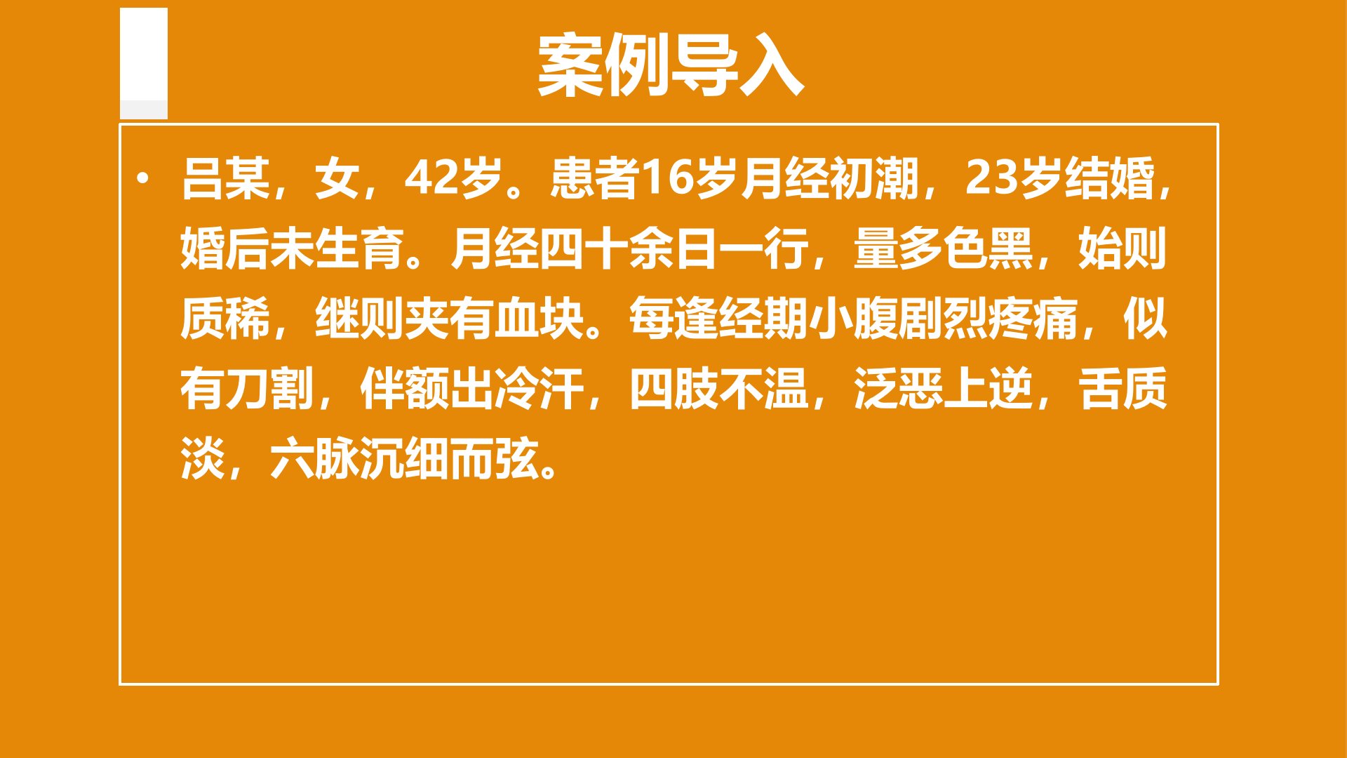 痛经【病因病机】【辨证要点】【治疗】【按语】【知识链接】案例导入吕某,女,42岁。患者16岁月经初潮,23岁结婚,婚后未生育。月经四十余日一行,量多色黑,始则质稀,继则夹有血块。每逢经期小腹剧烈疼痛,似有刀割,伴额出冷汗,四肢不温,泛恶上逆,舌质淡,六脉沉细而弦。痛经是指妇女经期或行经前后出现的周期性小腹疼痛,又称“经行腹痛”。西医学将其分为原发性痛经和继发性痛经两种。原发性痛经是指检查生殖器官无明显异常者,又称为功能性痛经,多见于青年女性。继发性痛经多继发于生殖器官的器质性病变,如子宫内膜异位症、子宫腺肌病、慢性盆腔炎、子宫肌瘤、宫颈口粘连狭窄等。【病因病机】本病常与素体虚弱、外感六淫、情志...