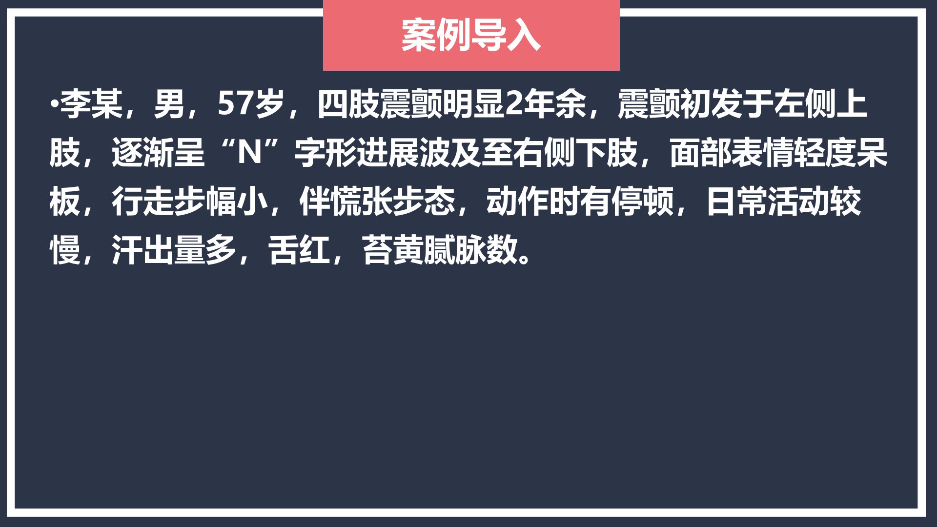 本文以57岁男性李某的震颤麻痹(帕金森病)案例导入介绍了该病是以静止性震颤、肌强直等为主要特征的锥体外系疾病分原发性和继发性两种属中医学“颤证”范畴。病因常与年老体虚、情志过极等有关基本病机为虚风内动或痰热动风病位在脑病变脏腑主要在肝涉及脾、肾。辨证要点包括风阳内动、痰热风动、气血亏虚、髓海不足、阳气虚衰等证型。治疗方面基本治法为柔肝息风宁神定颤取督脉、足厥阴经穴为主主穴包括百会、四神聪等配穴依证型选择。其他治疗包括耳针法、头针法、穴位注射法等。针灸治疗本病有一定疗效但需坚持较长时间治疗患者应保持心情愉快起居有节。知识链接部分介绍了“颤三针”疗法对治疗帕金森病有独特优势。